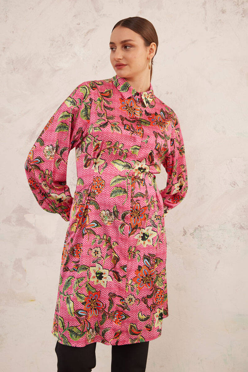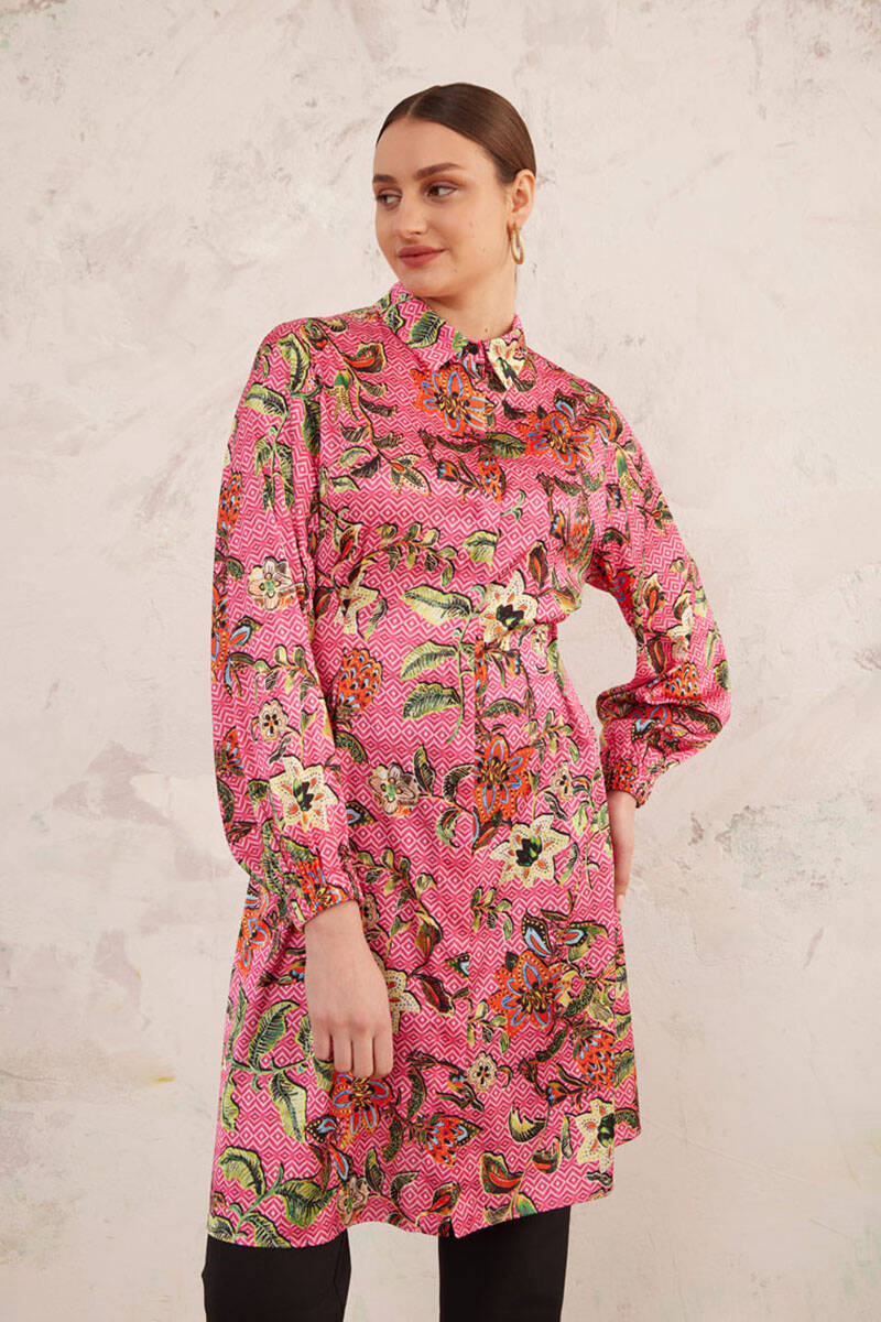 Pembe Desenli Arka Bel Lastikli Tunik