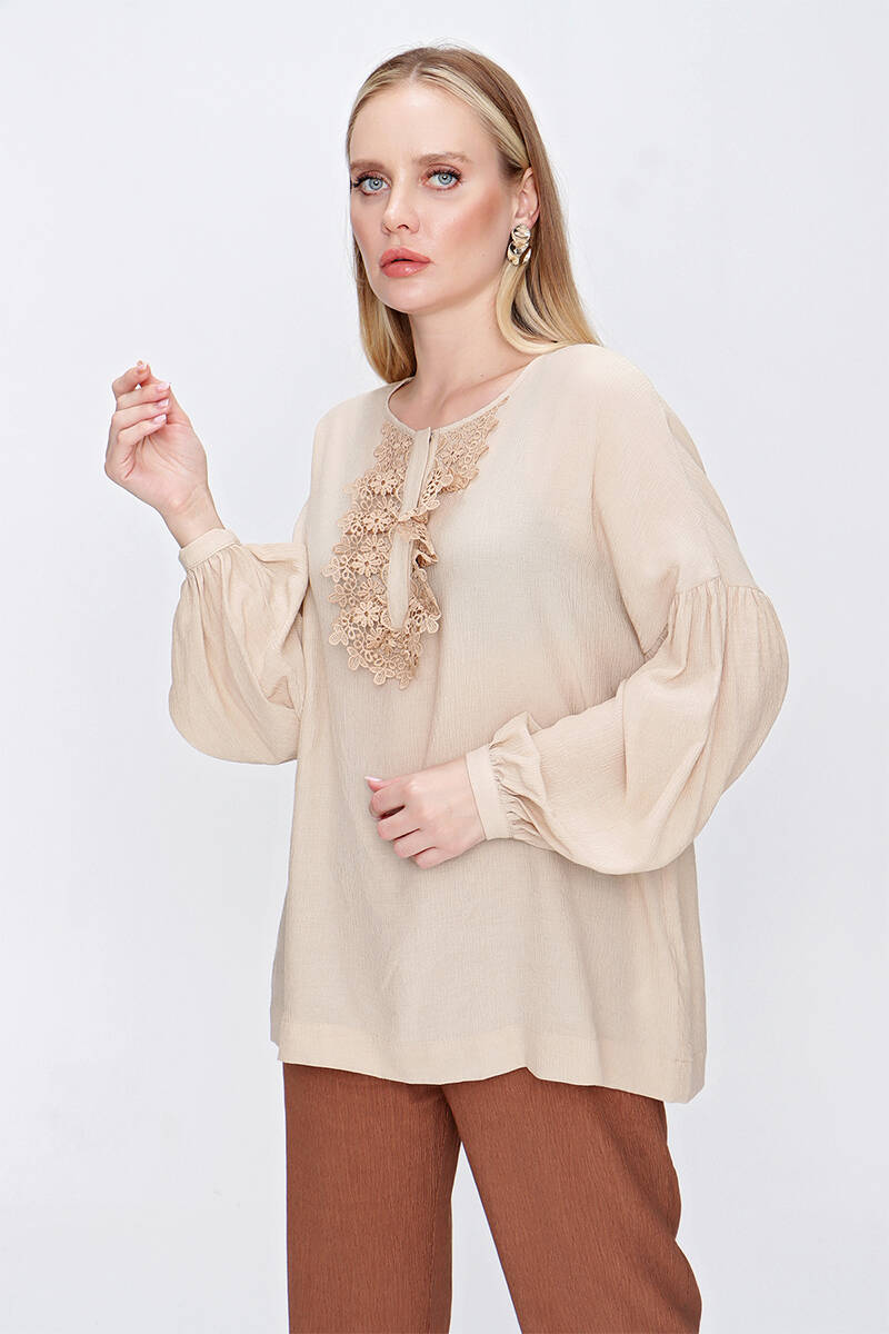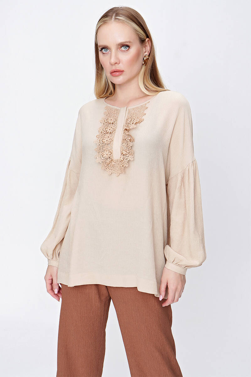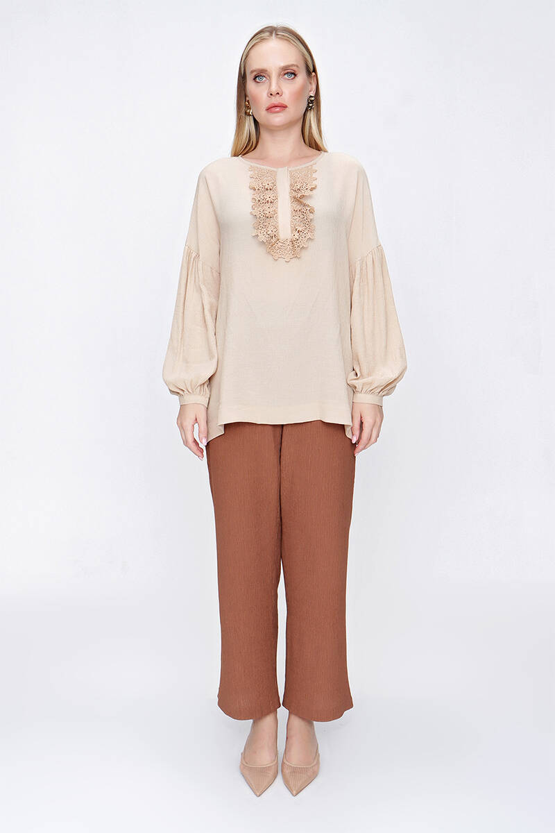 Antrasit Yaka İşlemeli Çizgili Bluz