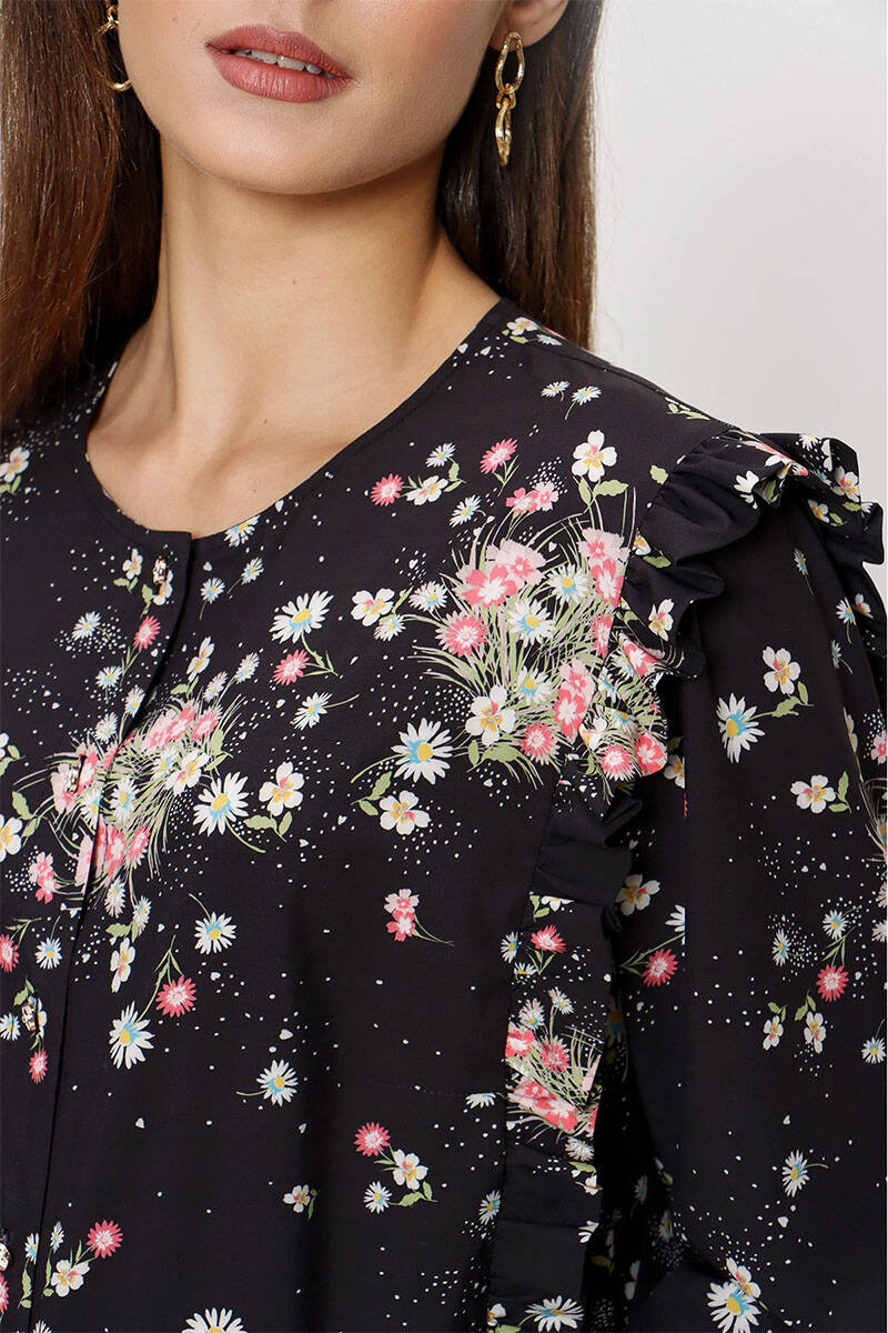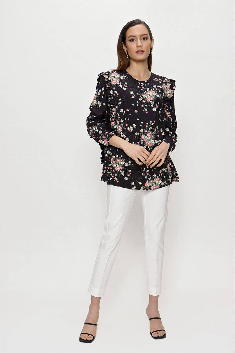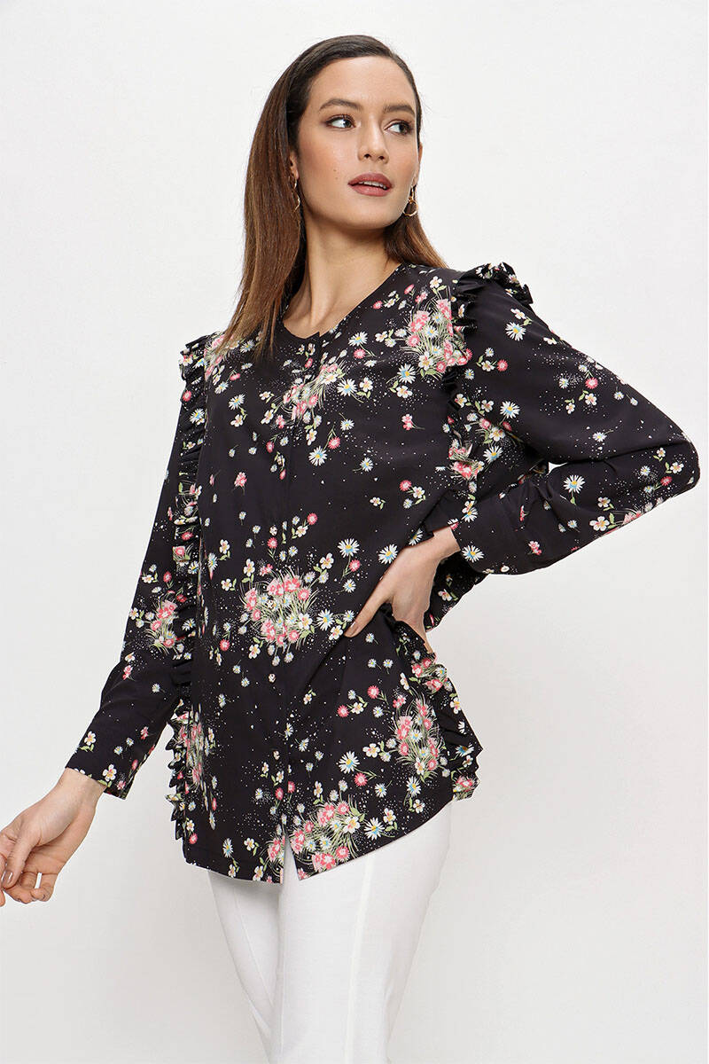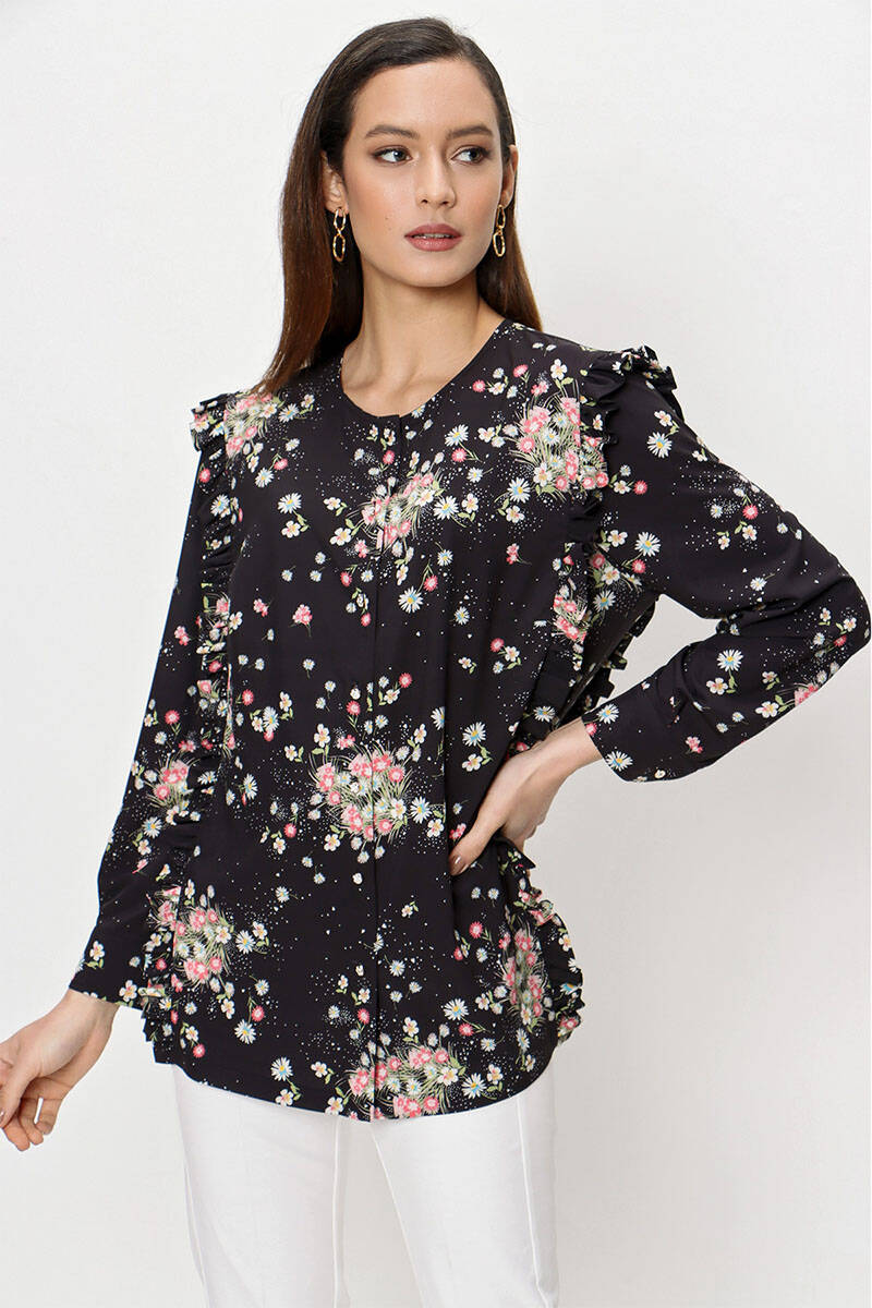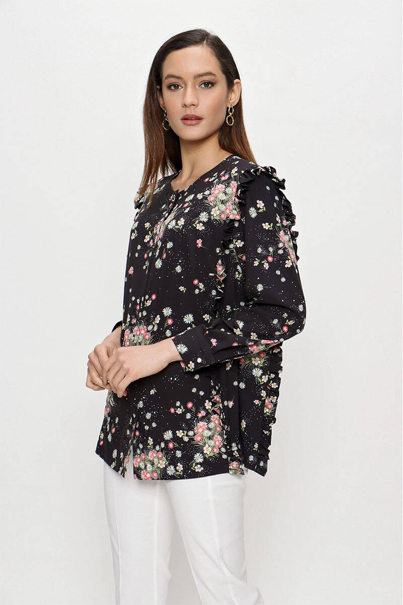 Lacivert Çiçek Desenli Fırfır Detaylı Bluz
