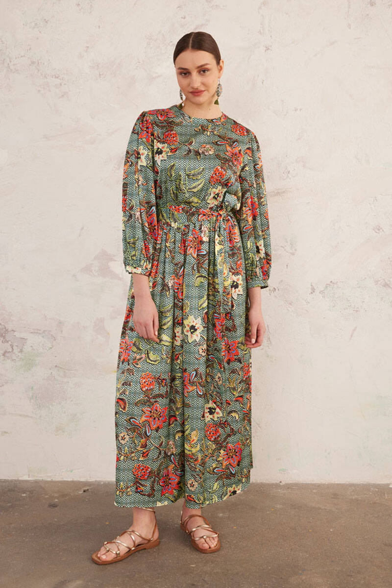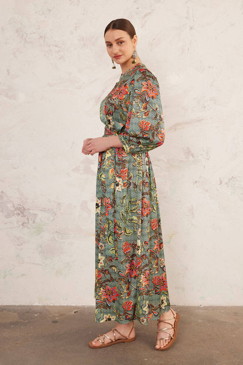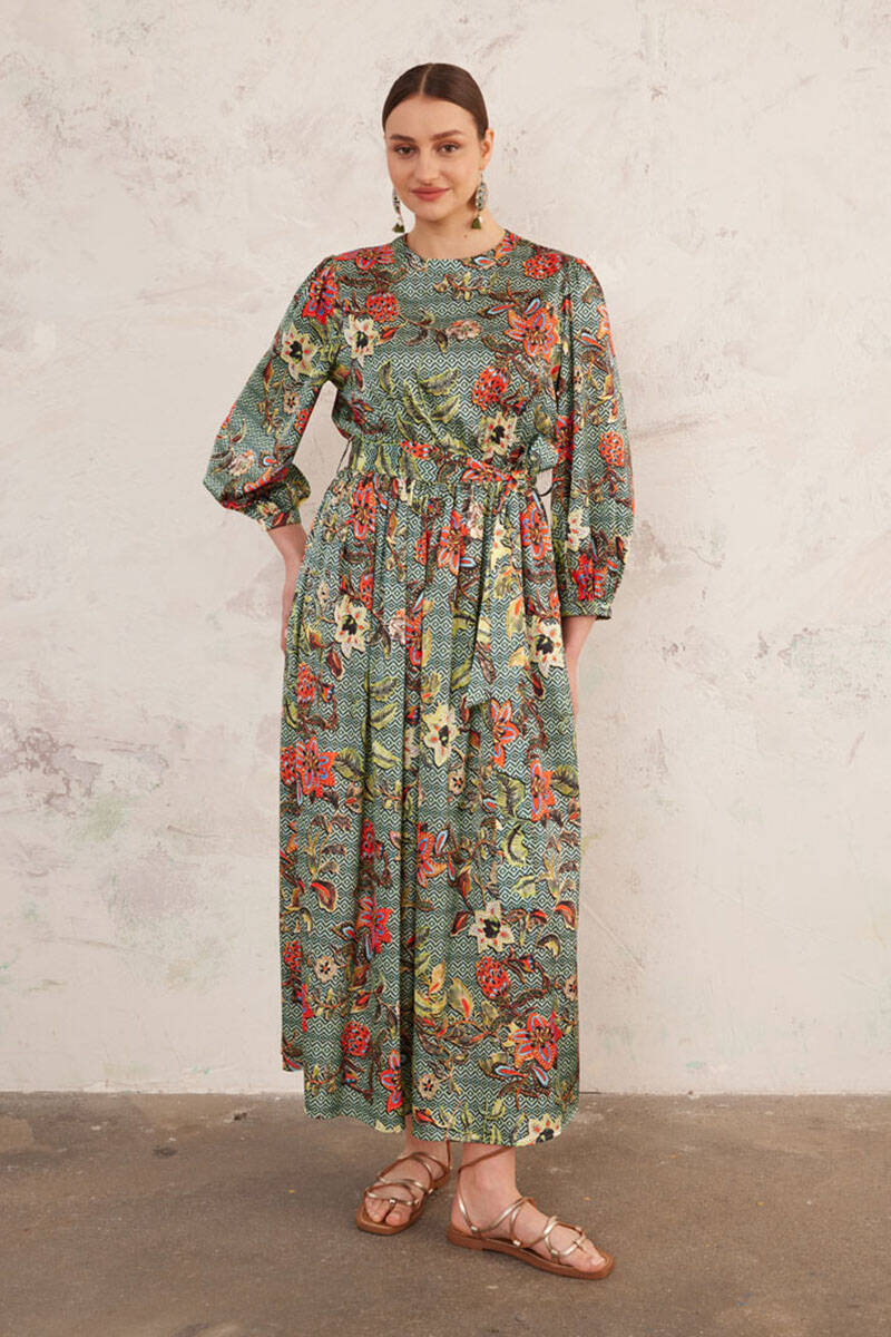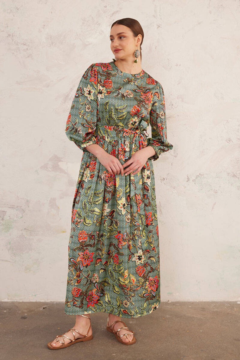Yeşil Kruvaze Kapama Belden Lastikli Elbise