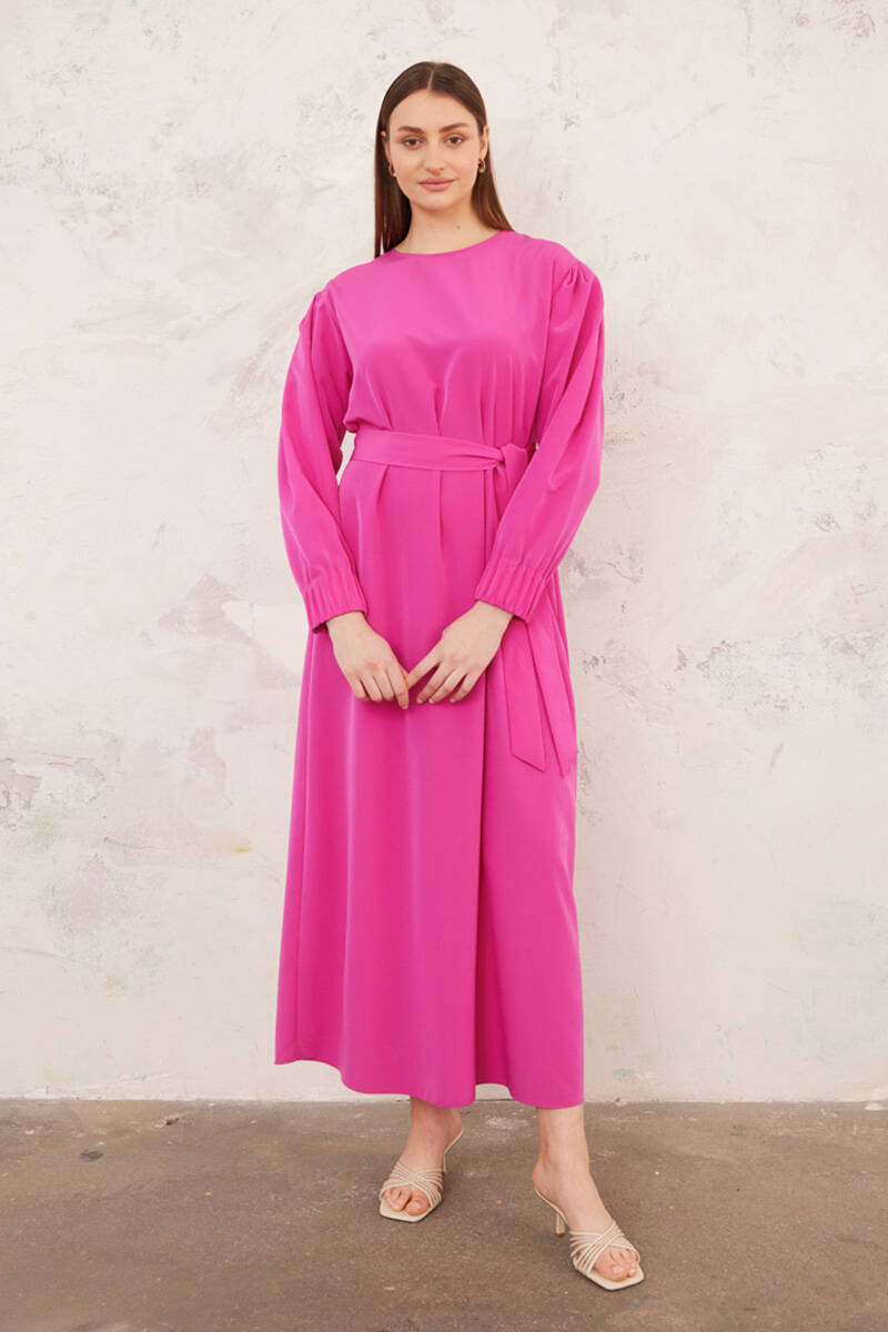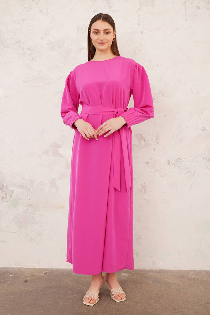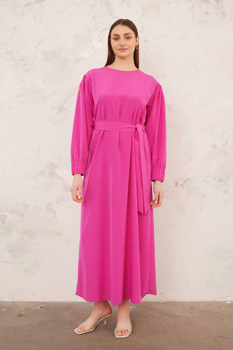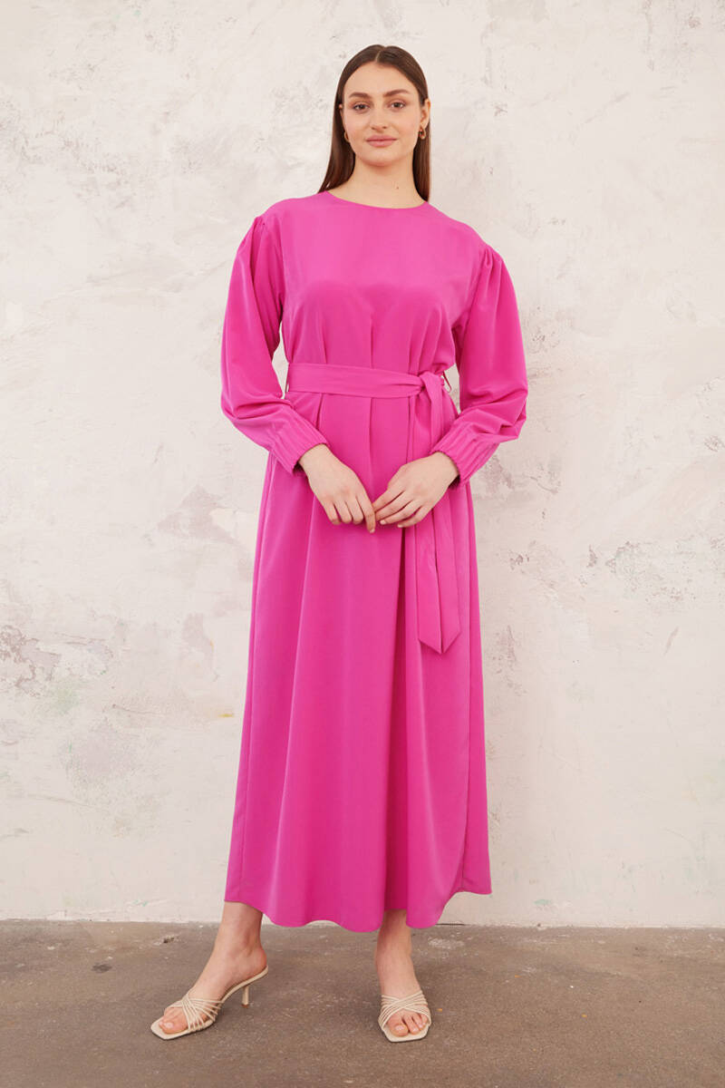 Ekru Belden Kuşaklı Pileli Elbise