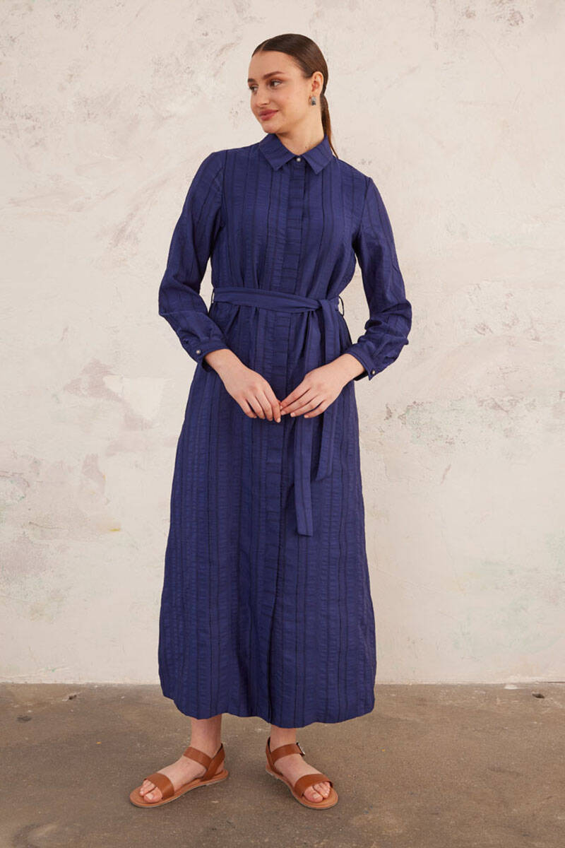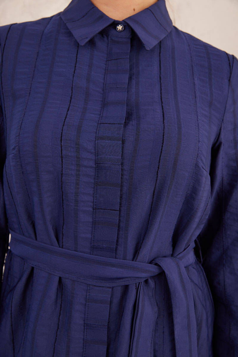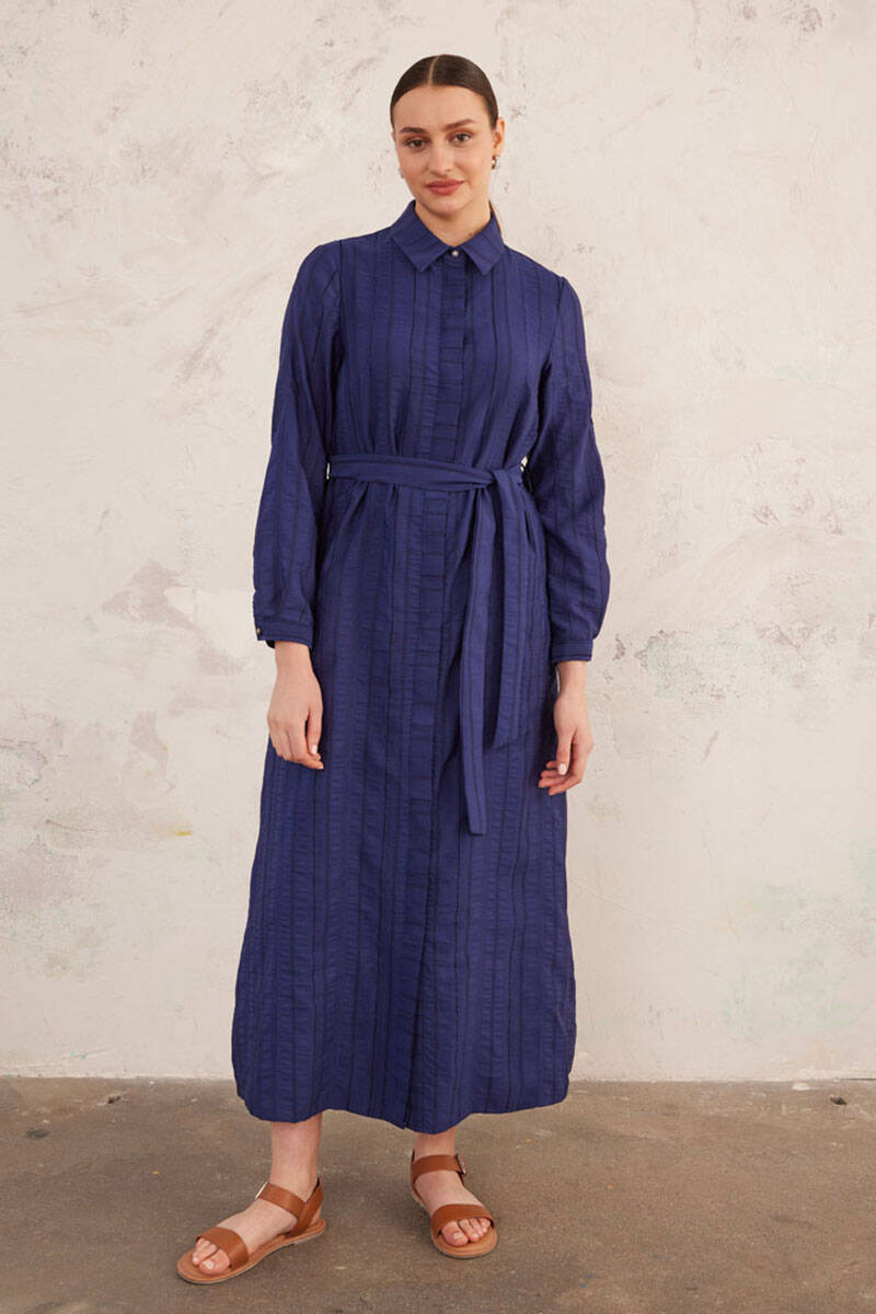 Lacivert Dokulu Kumaş Belden Kemerli Elbise
