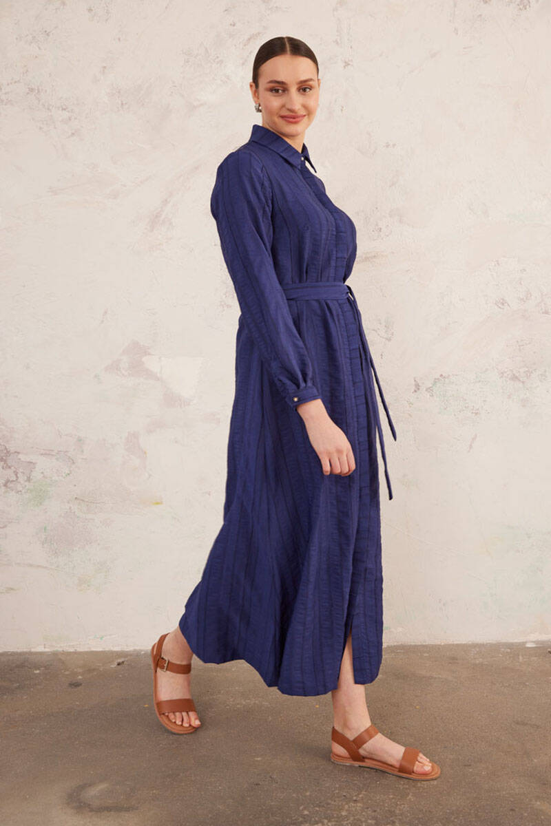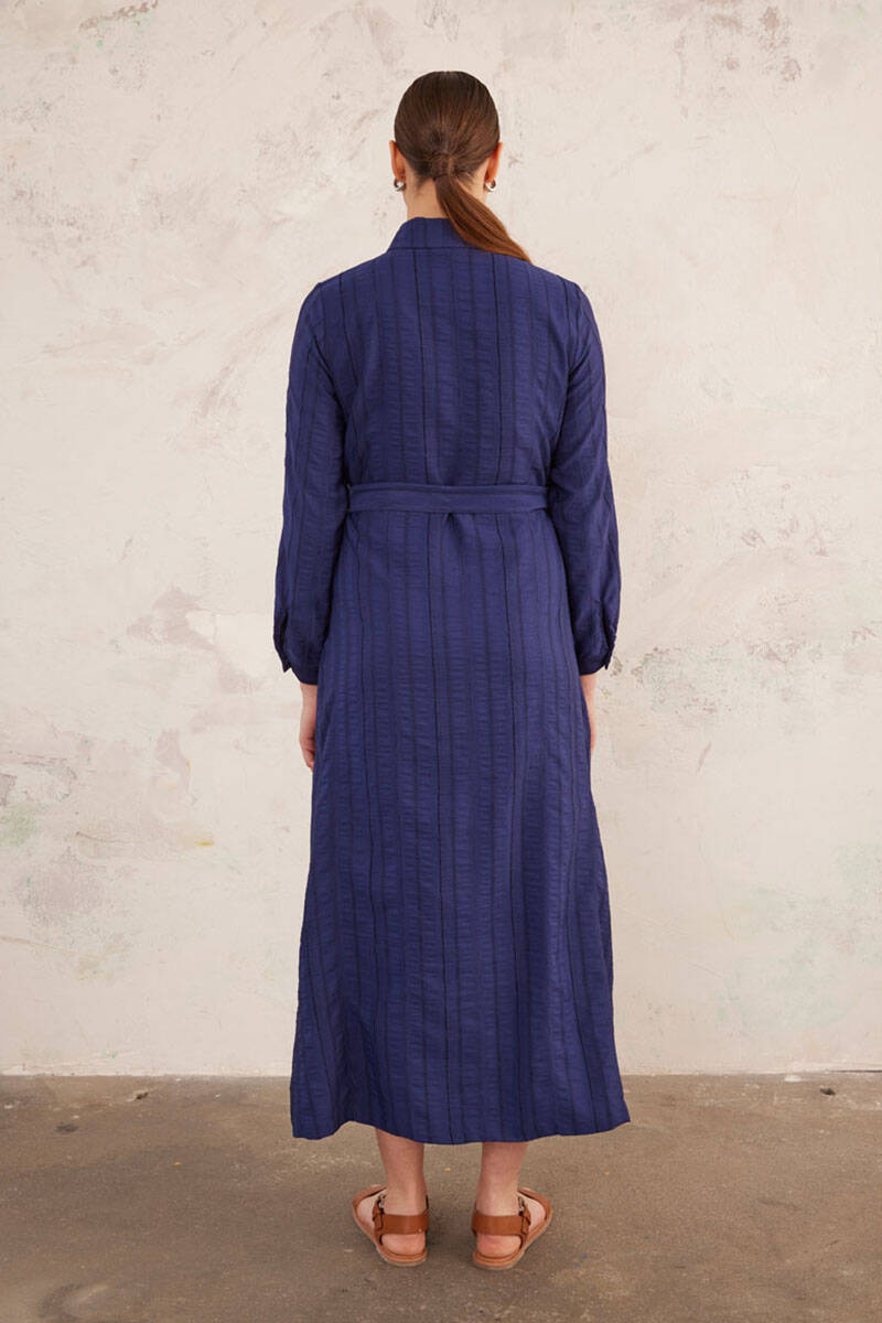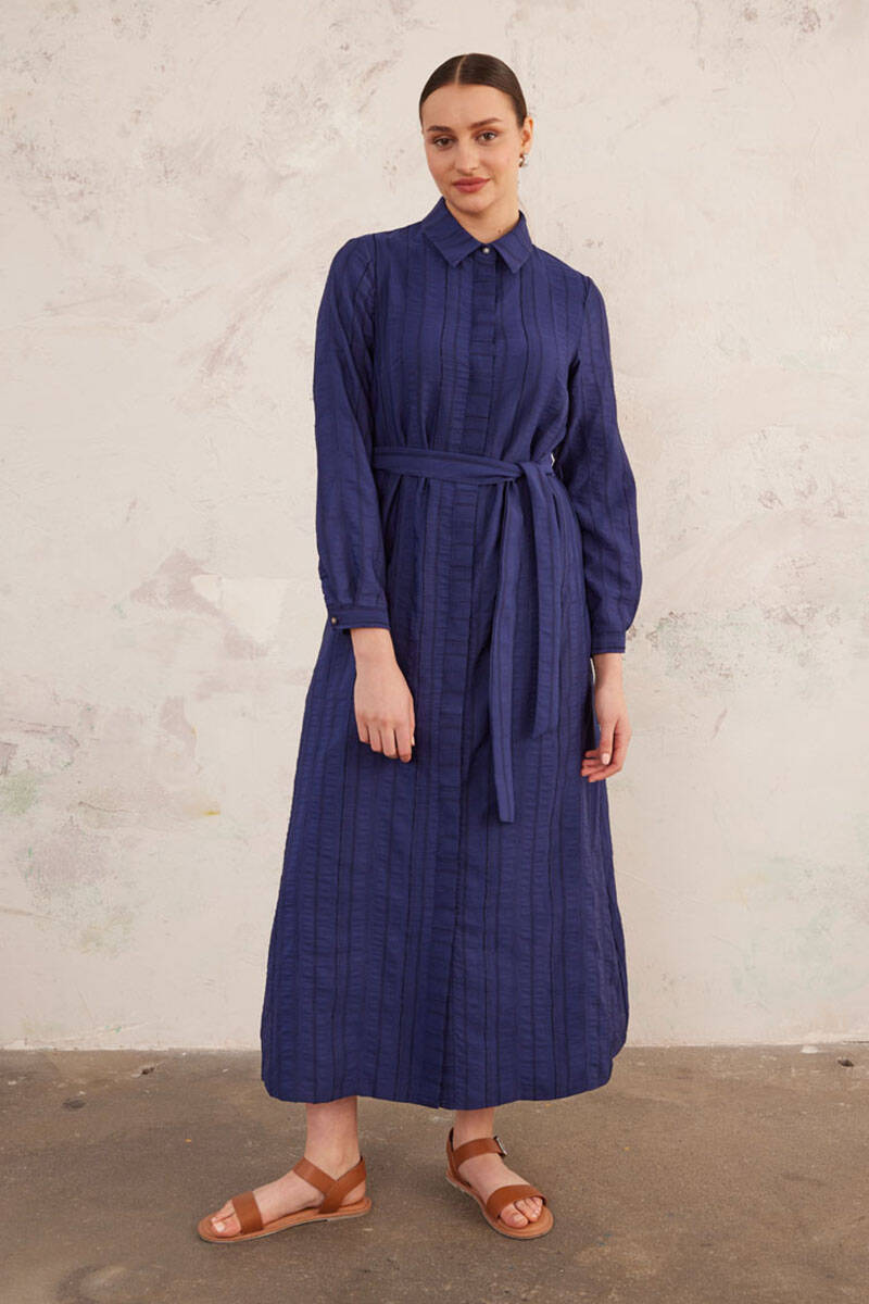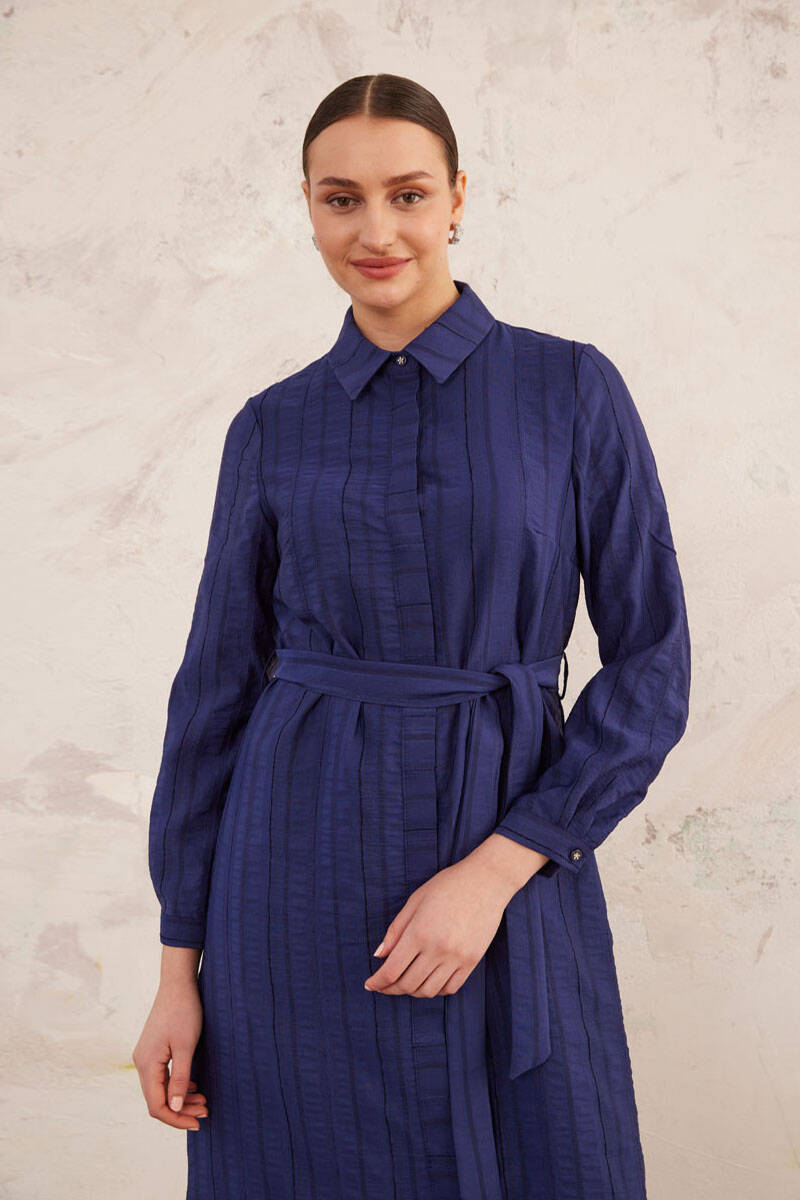 Lacivert Dokulu Kumaş Belden Kemerli Elbise