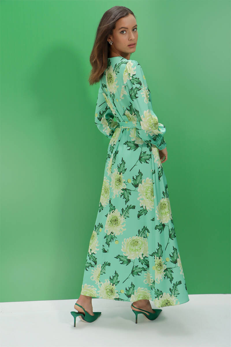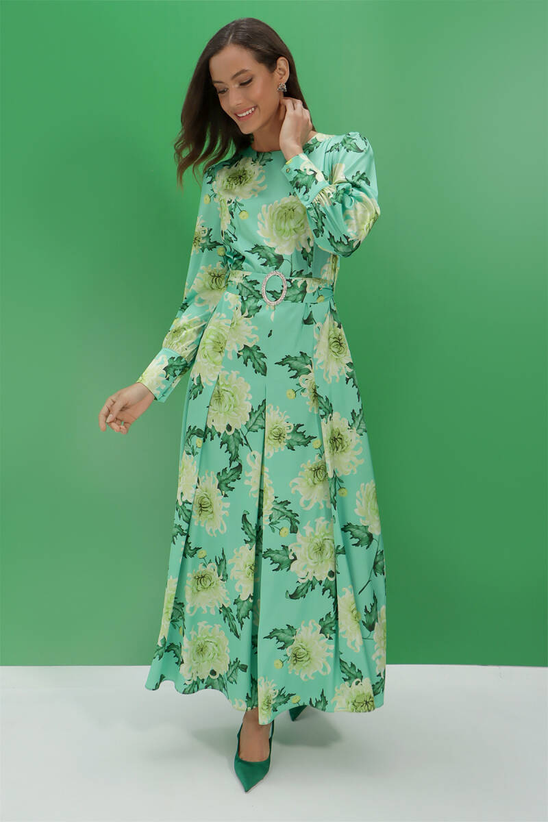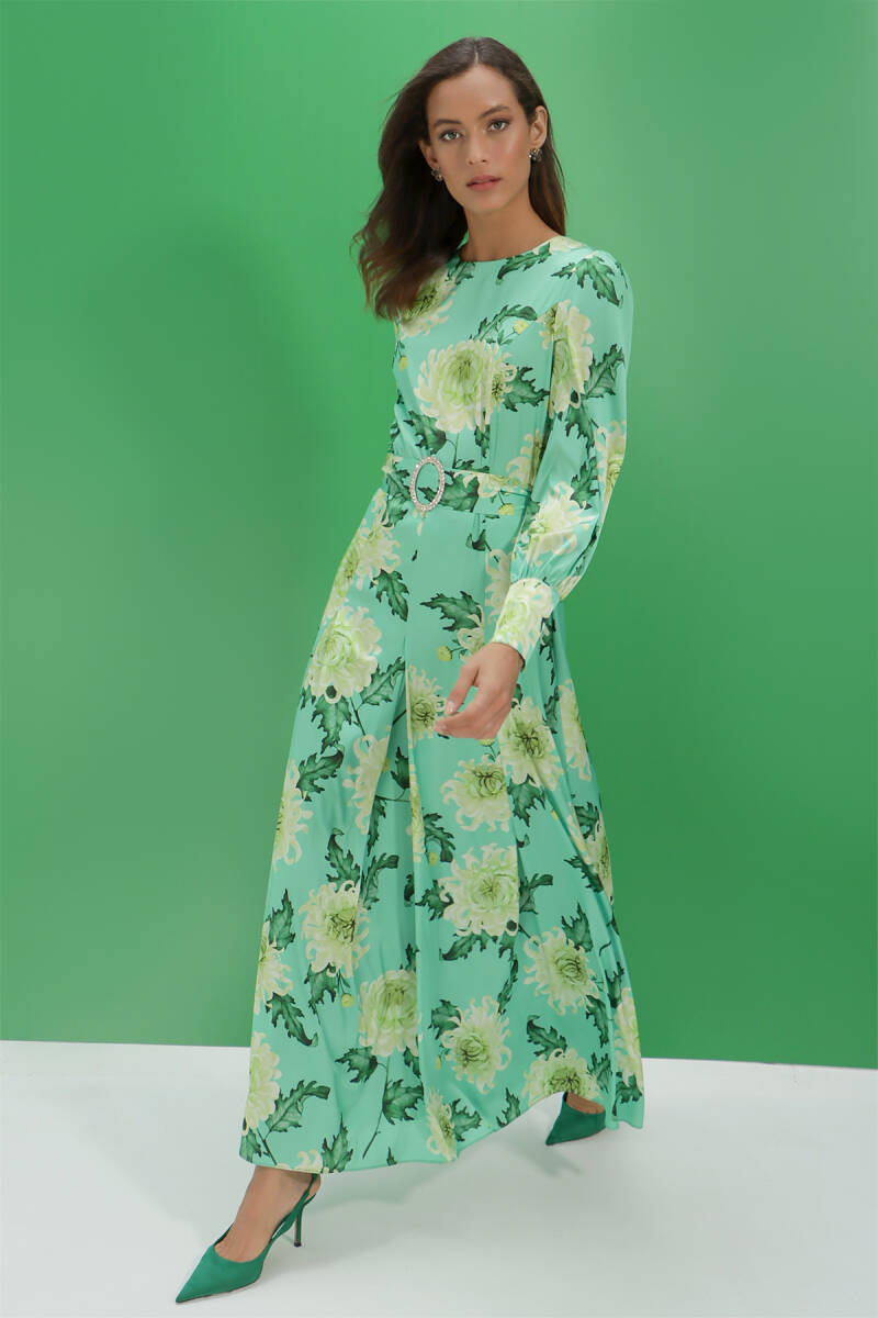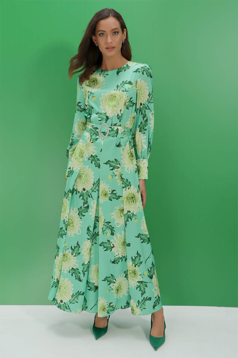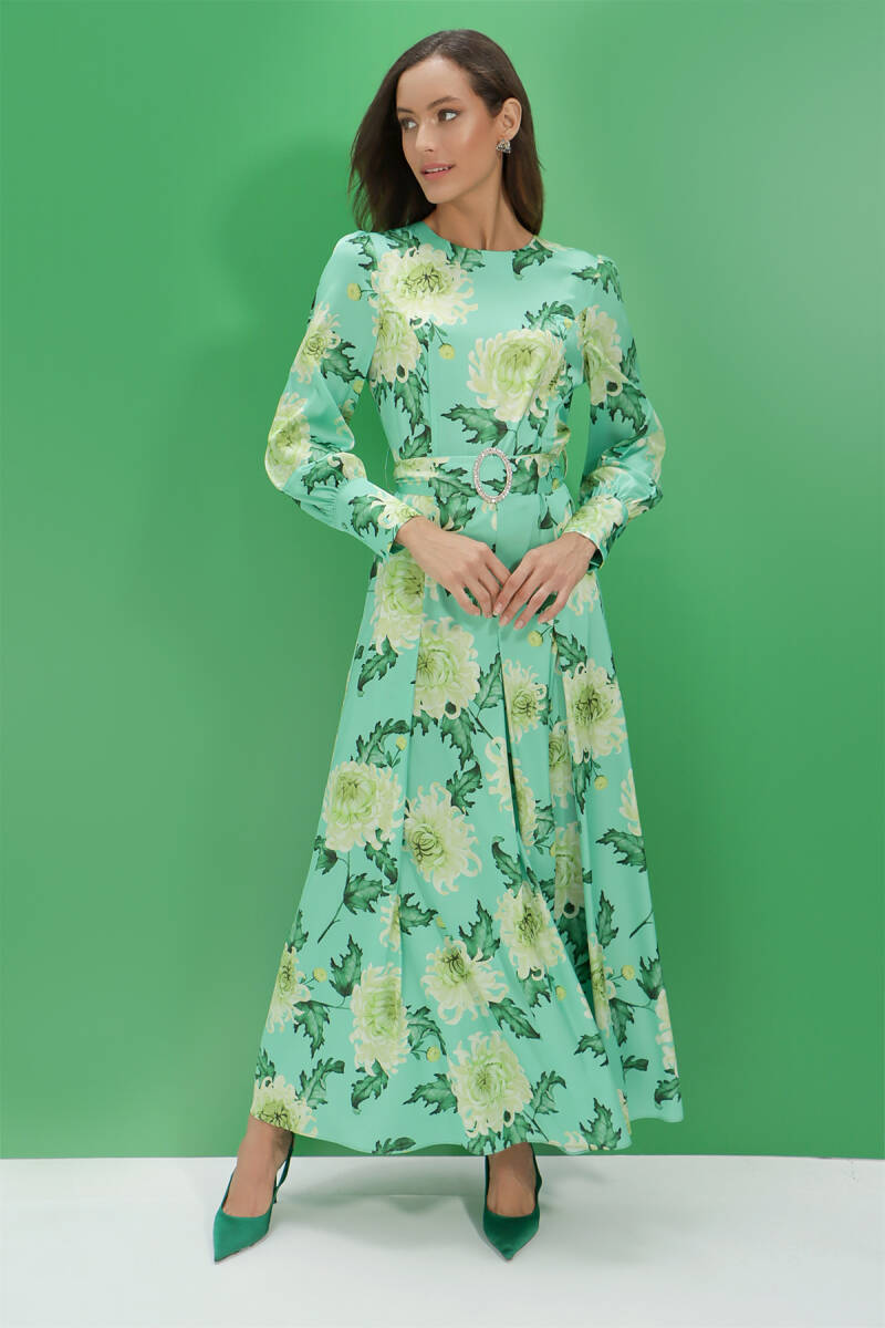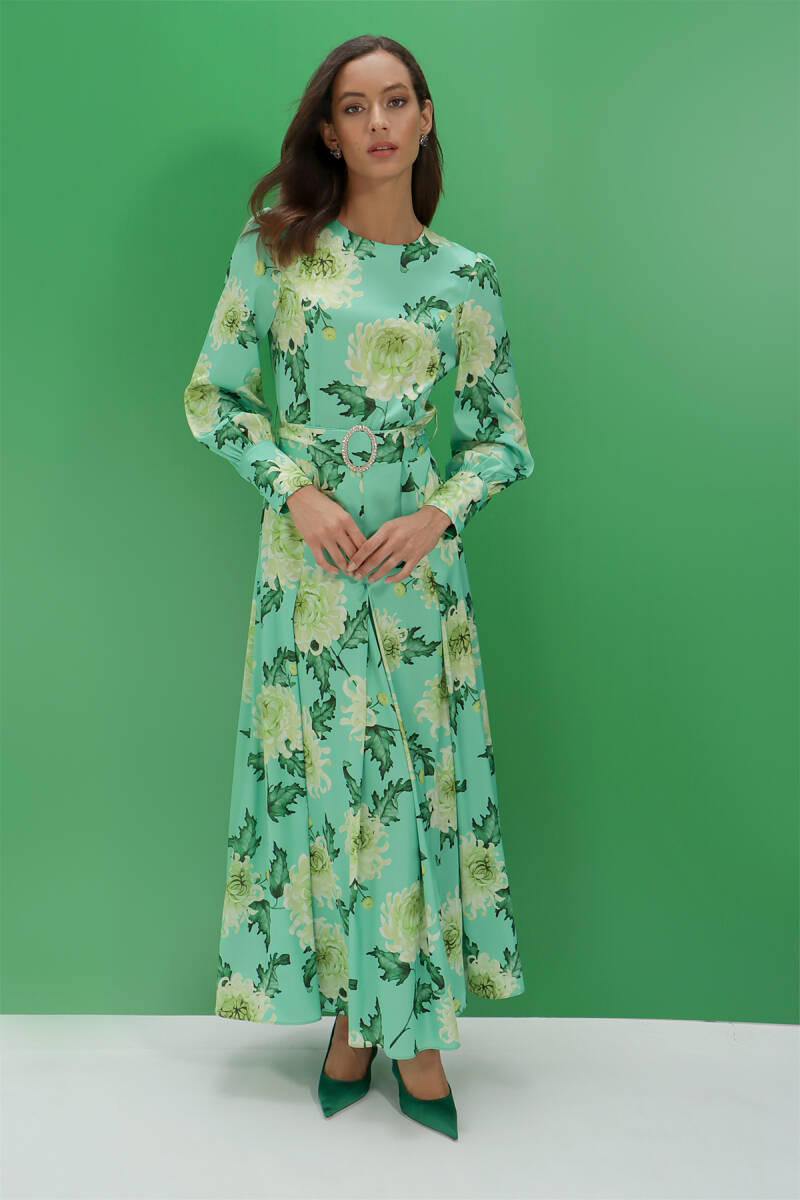 Yeşil İpek Tuşeli Çiçek Desenli Elbise