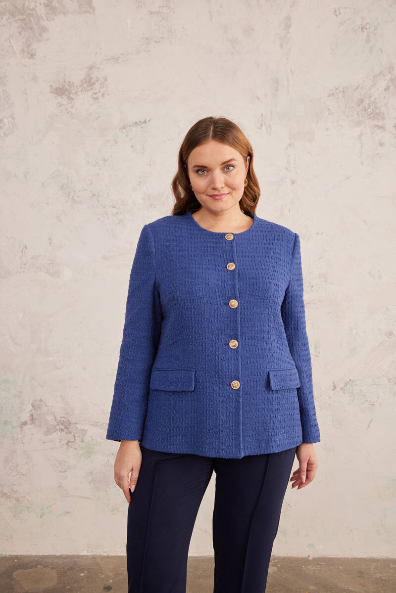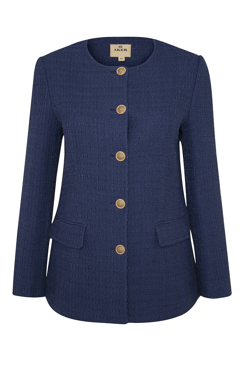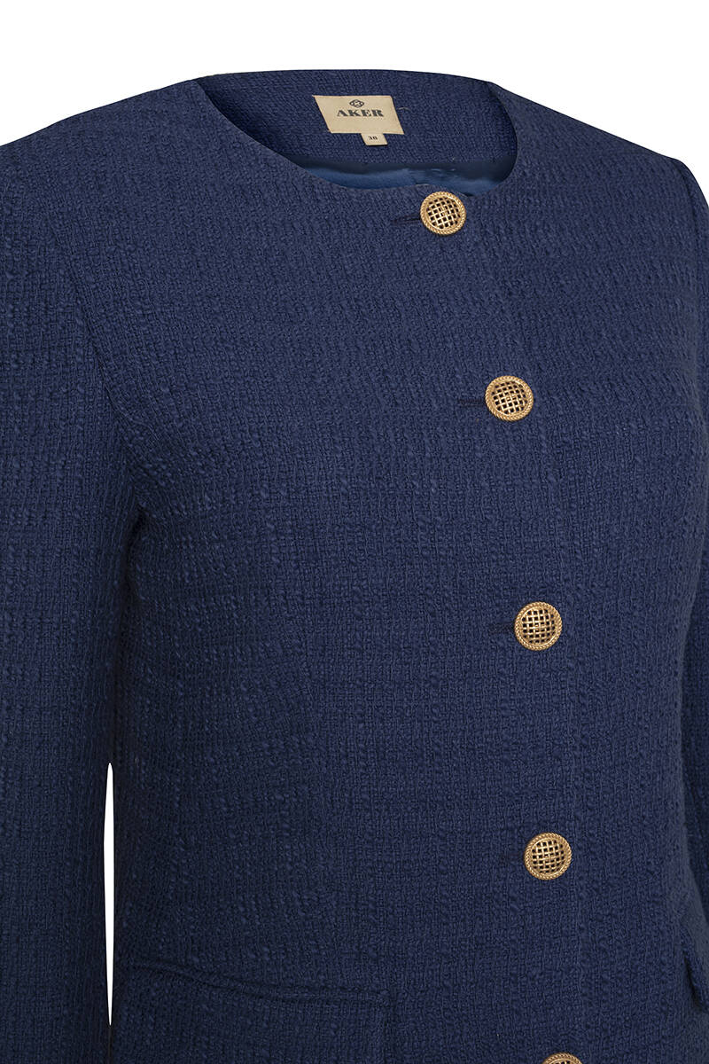 Lacivert Gold Düğme Detaylı Yakasız Düz Kesim Ceket