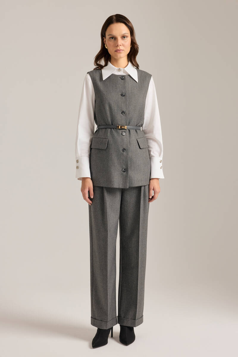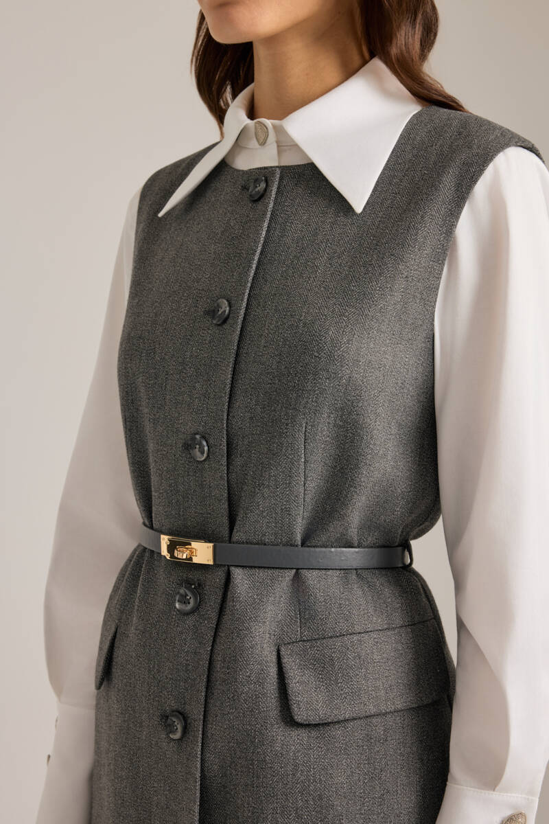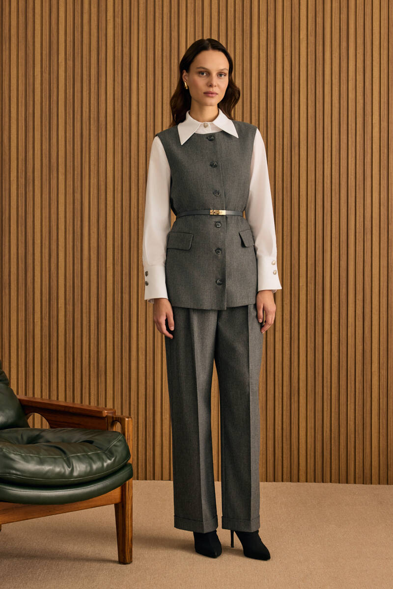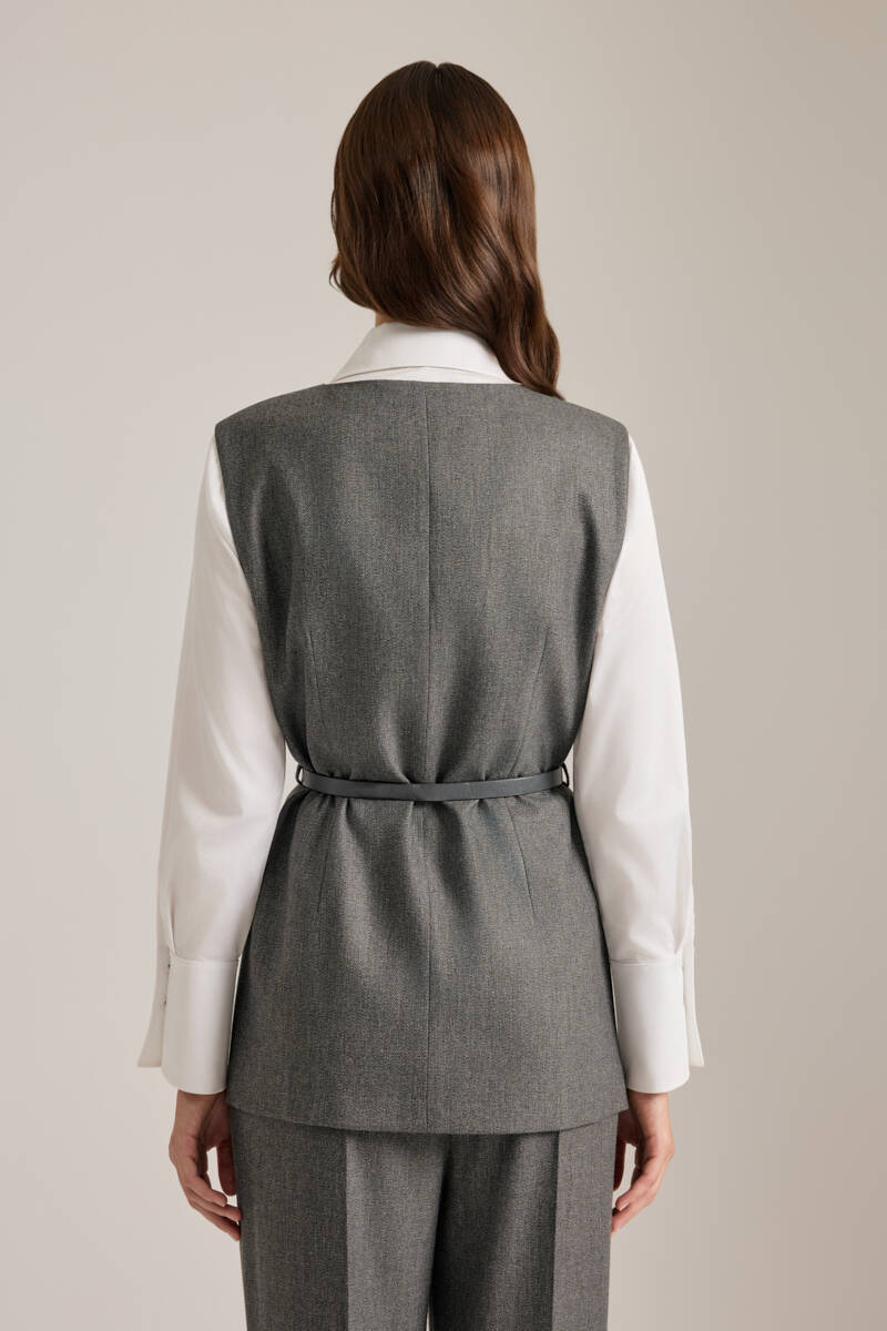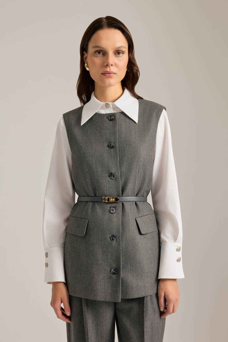 Antrasit Deri Kemer Detaylı Dokuma Yelek