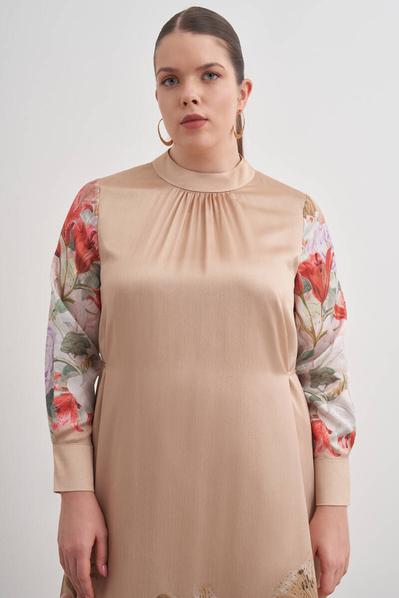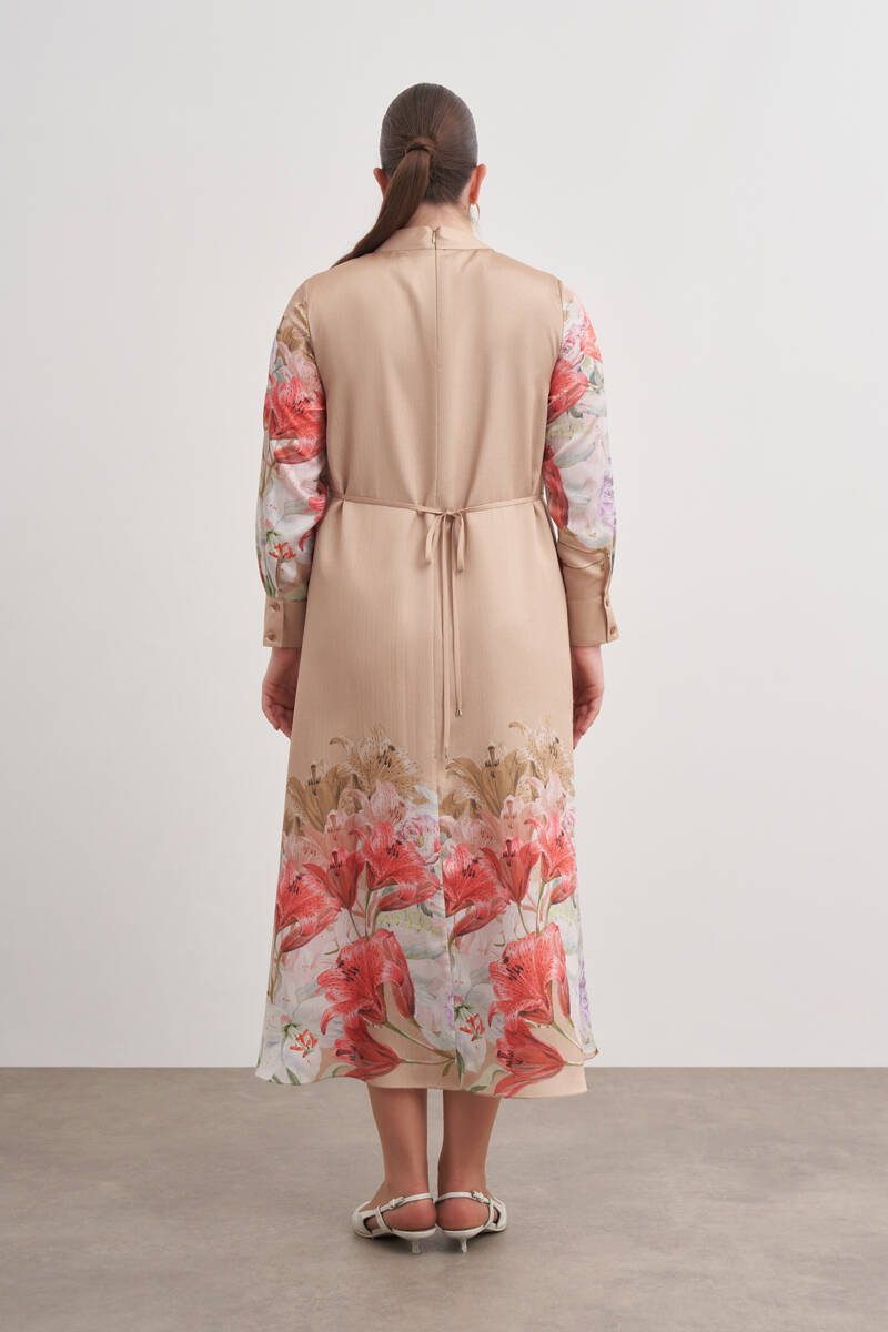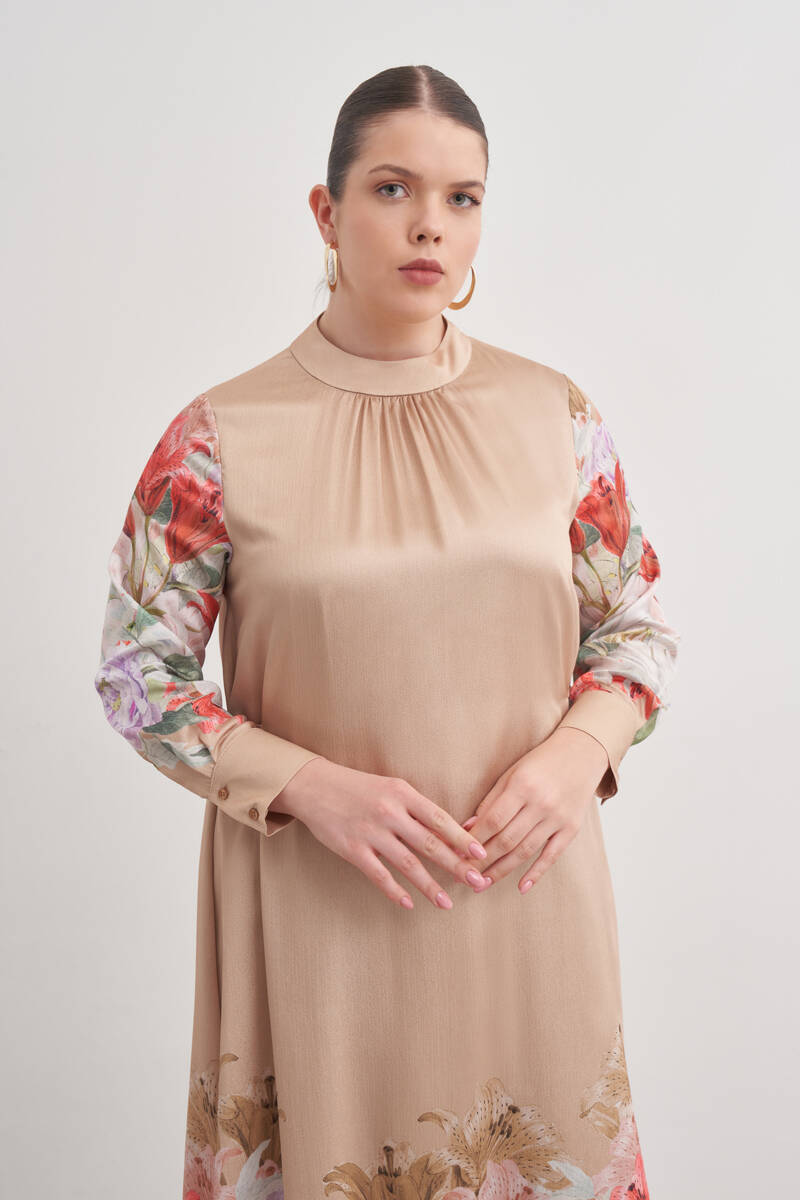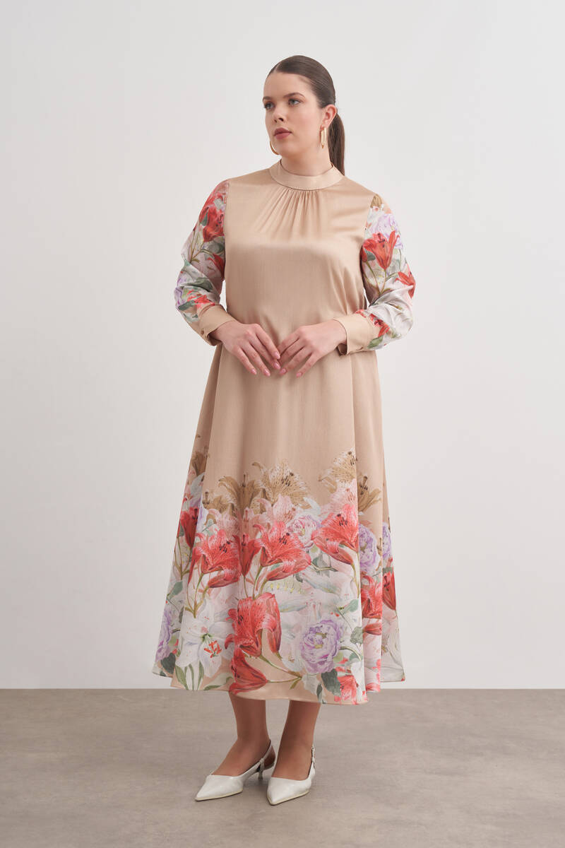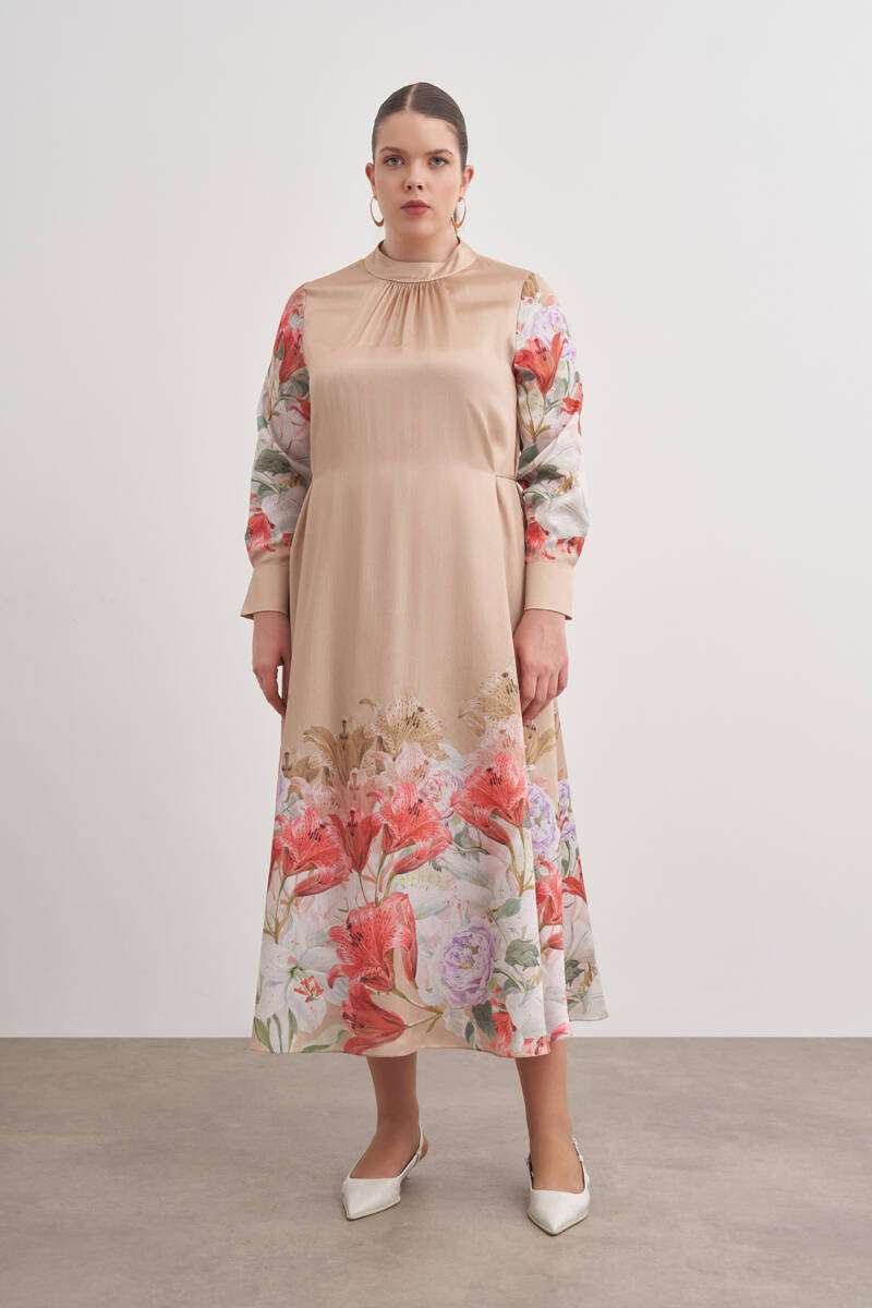 Bej Pano Çiçek Desenli Viscon Elbise
