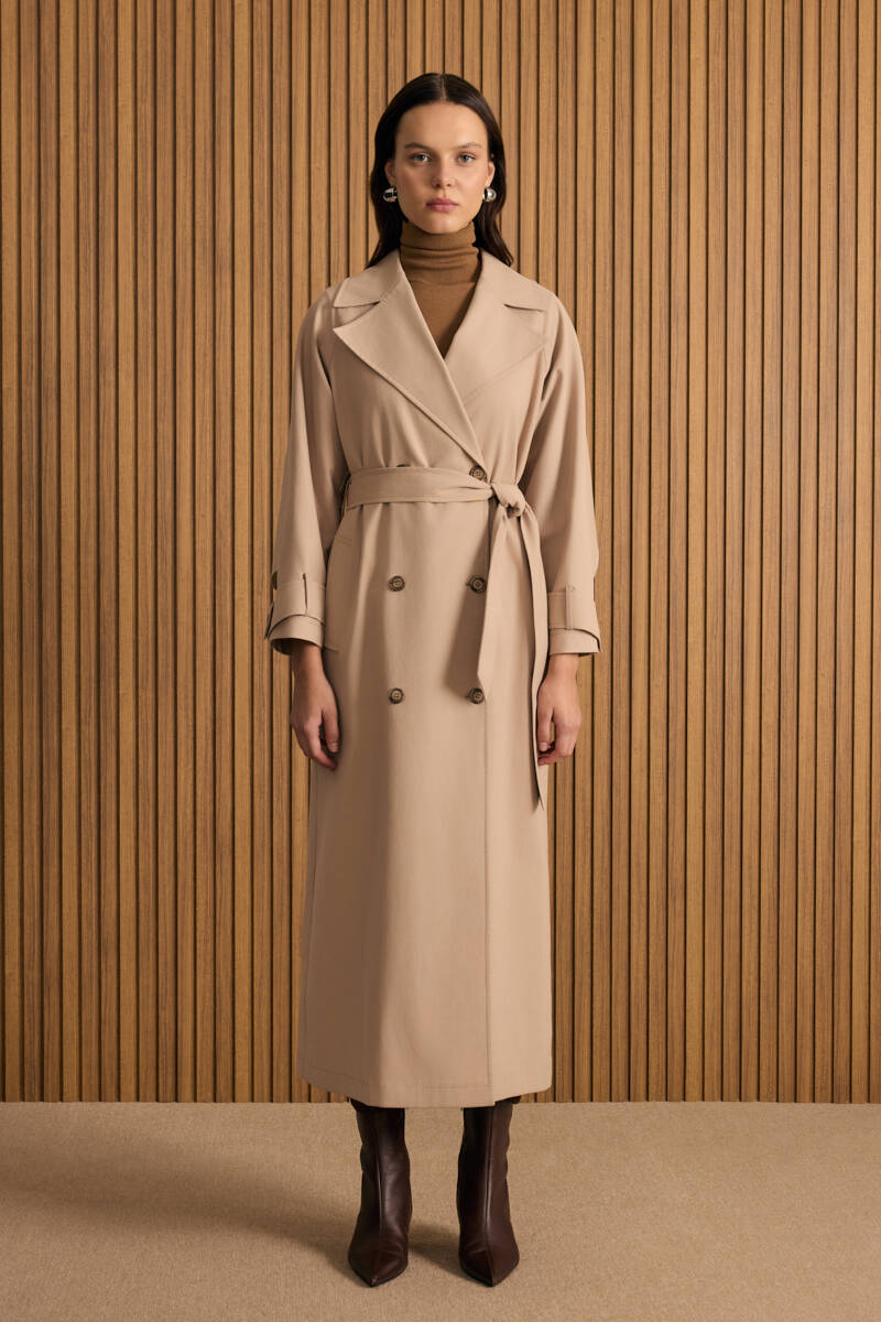 Bej Yanları Yırtmaçlı Keten Pardösü