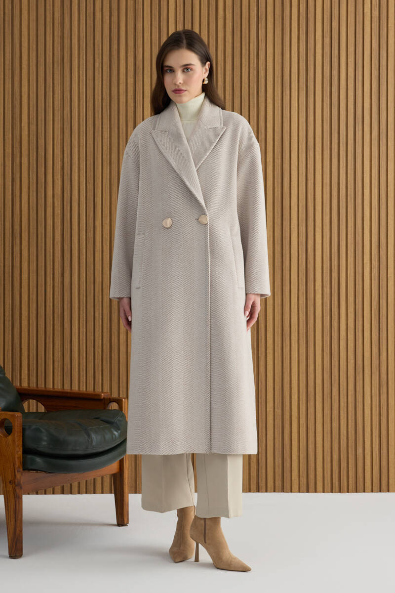 Ekru Kruvaze Kapamalı Pens Detaylı Manto