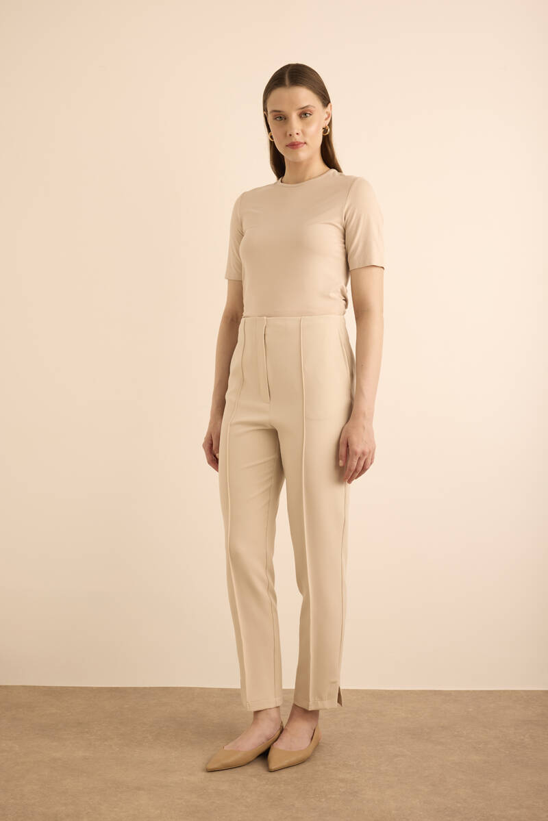 Bej Beli Lastik Detaylı Krep Pantolon