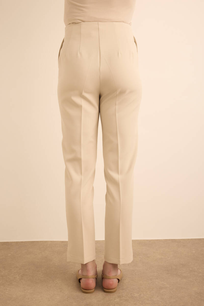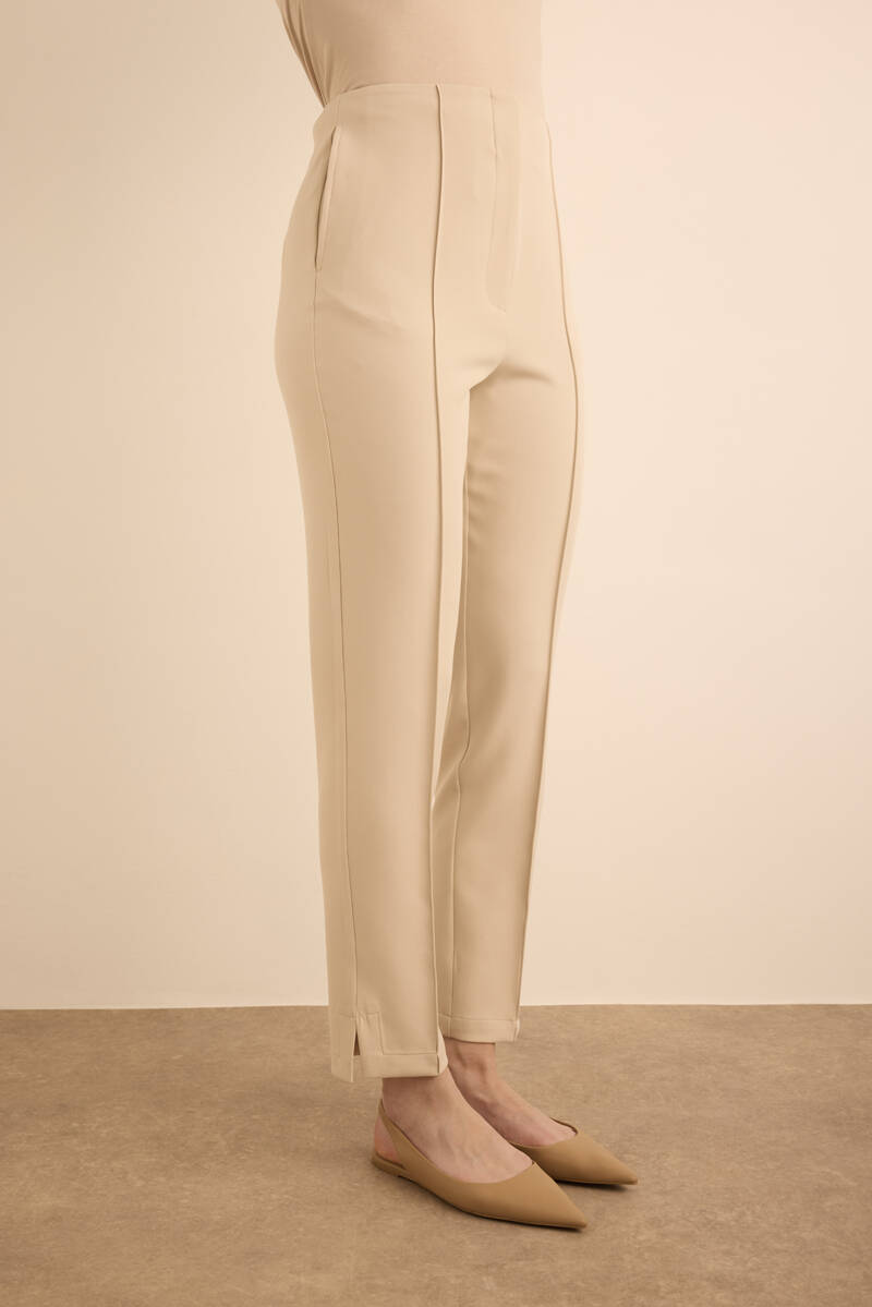 Bej Beli Lastik Detaylı Krep Pantolon