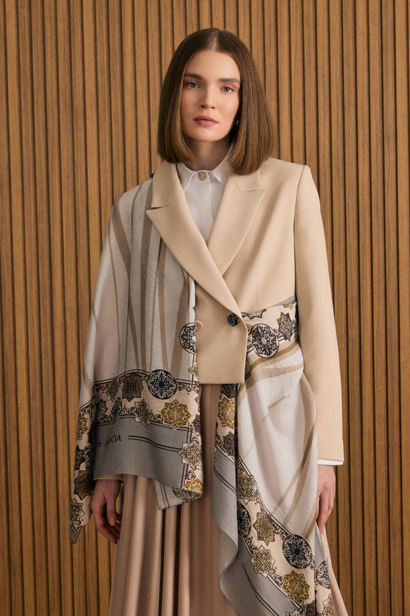 Ekru Yaprak Desenli Keten Kısa Ceket