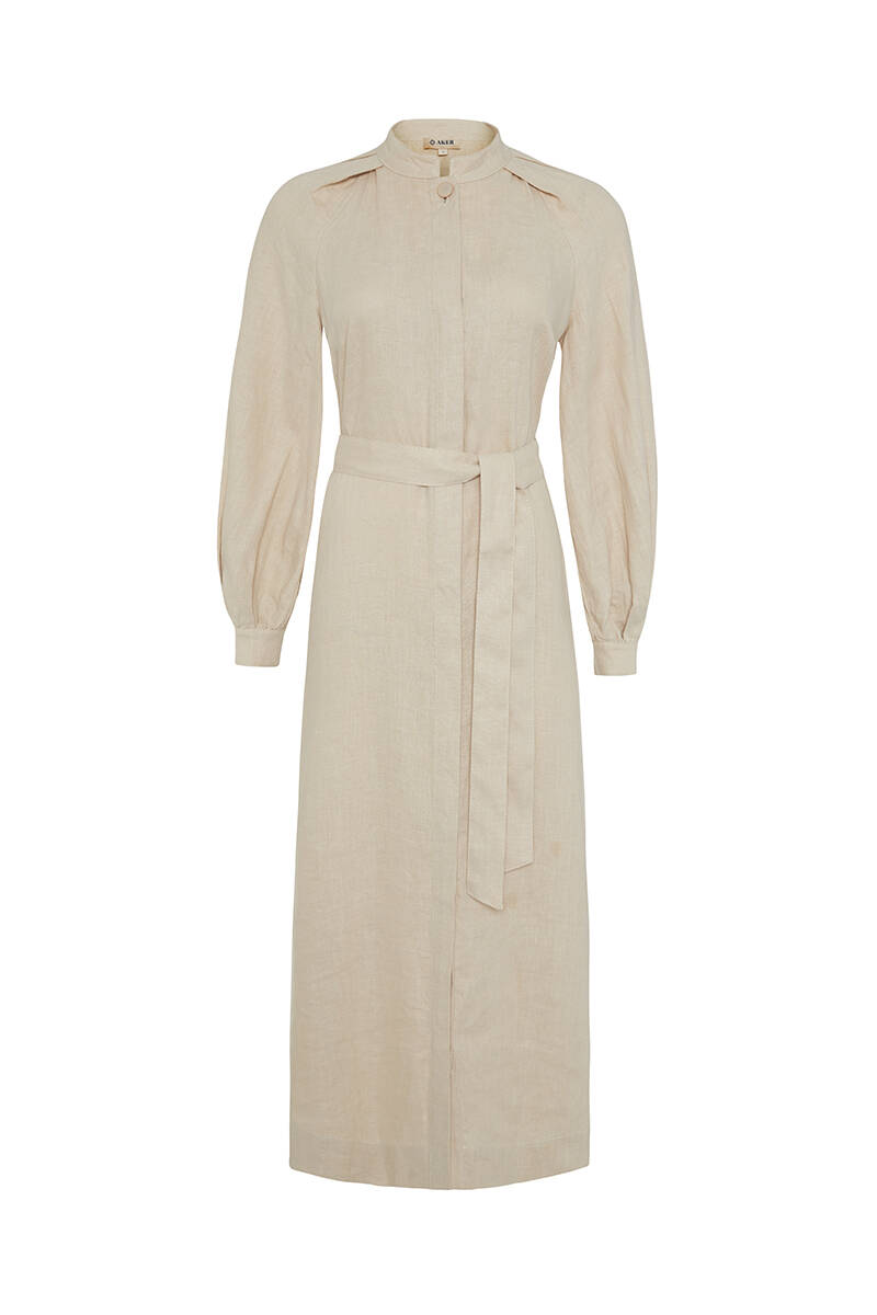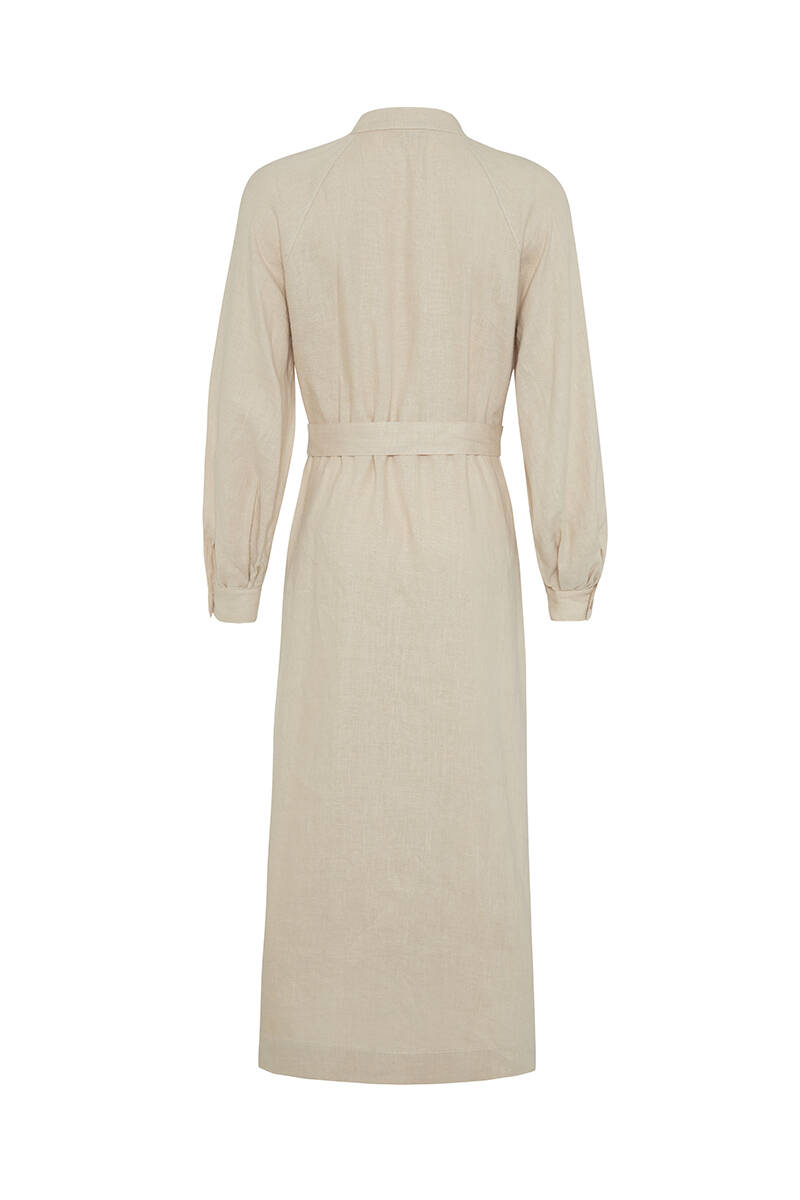 Ekru Belden Kuşaklı Pileli Elbise