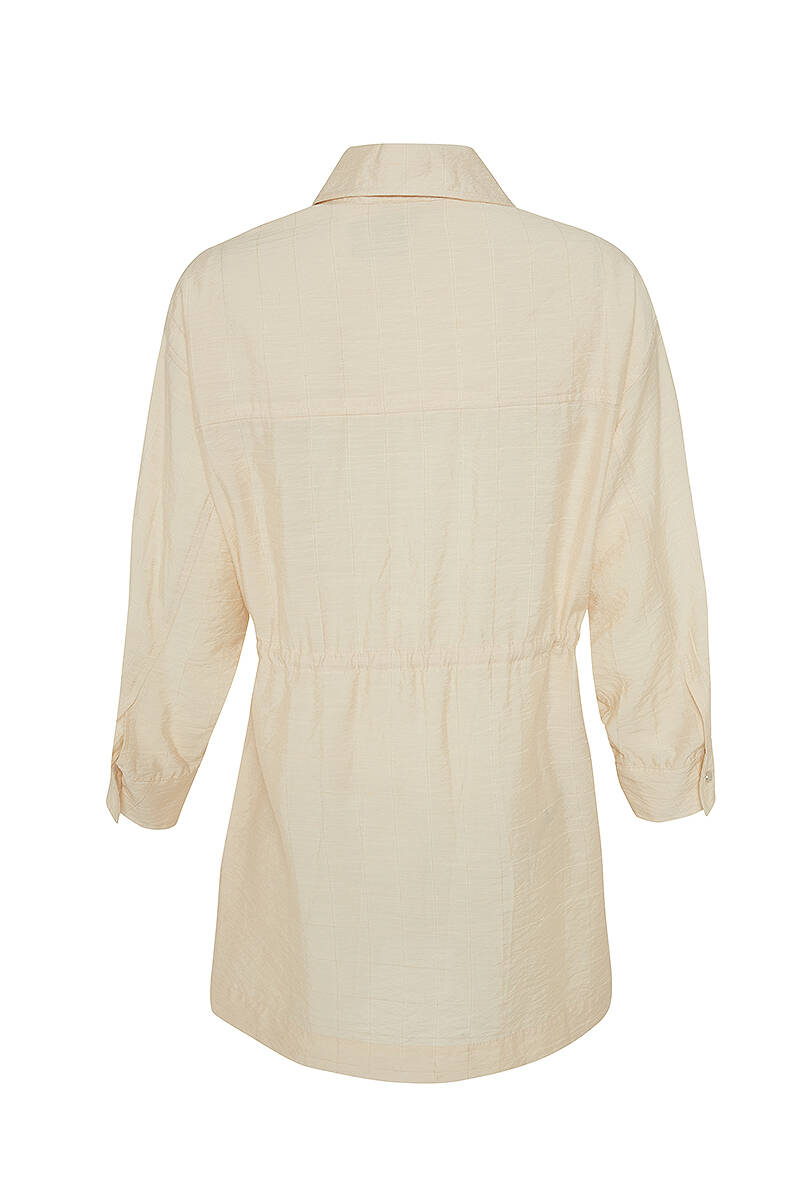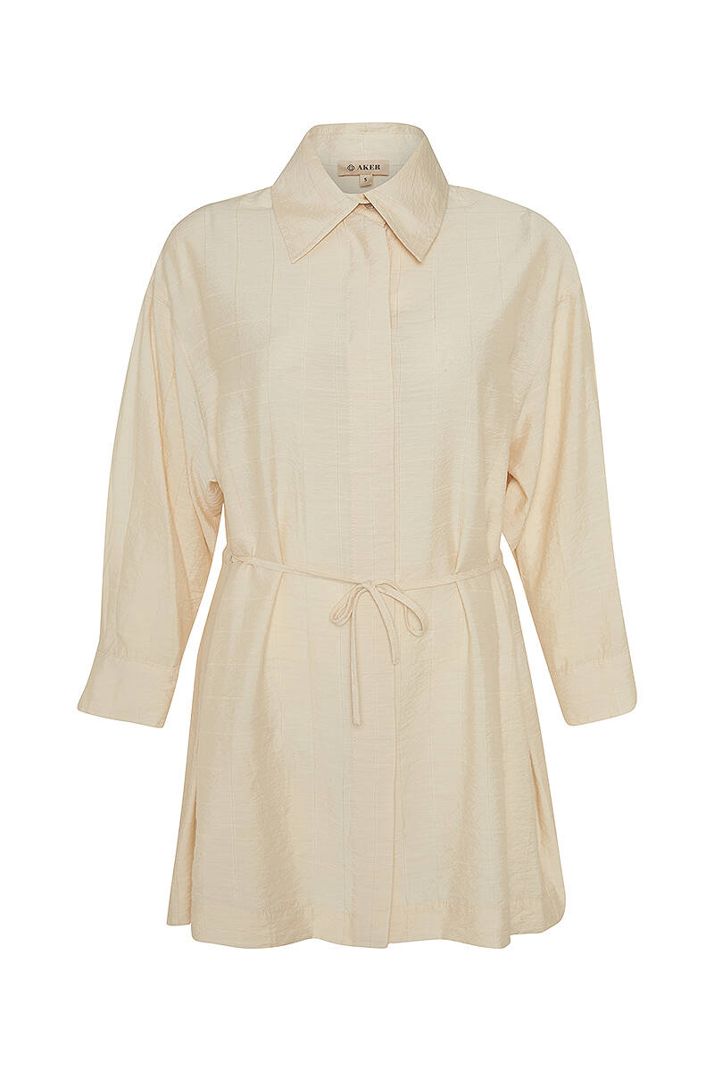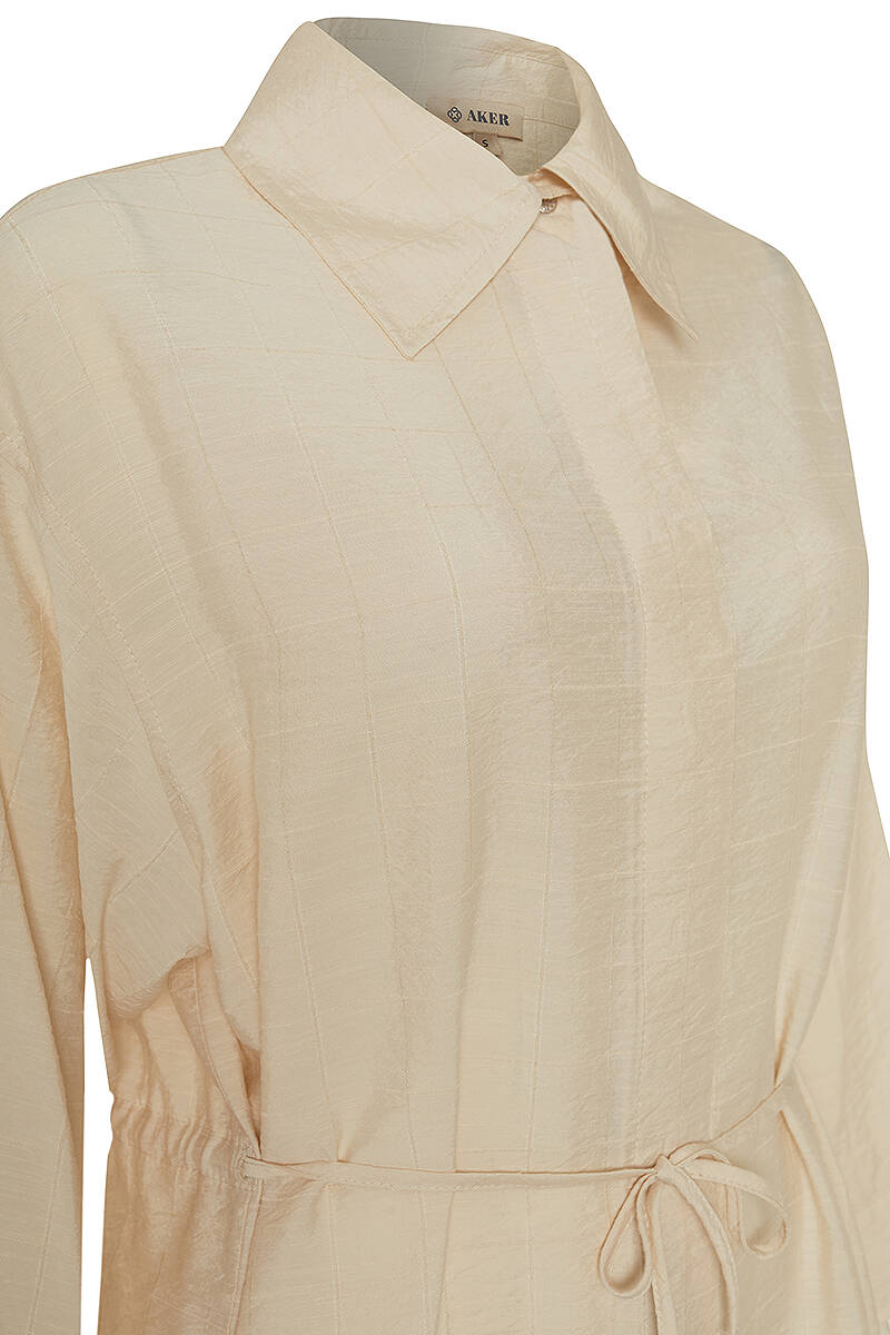 Bej Kare Dokulu Kumaş Belden Büzgülü Tunik