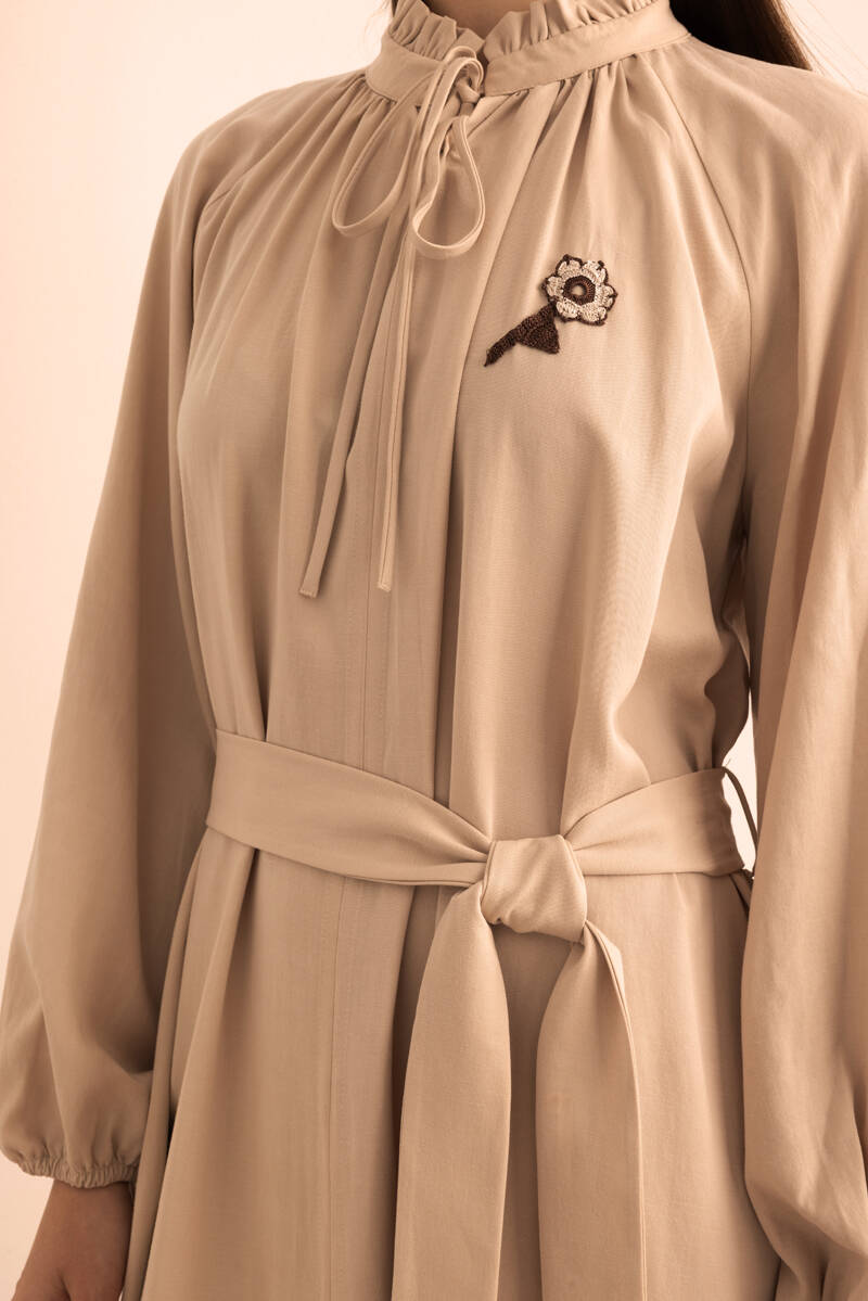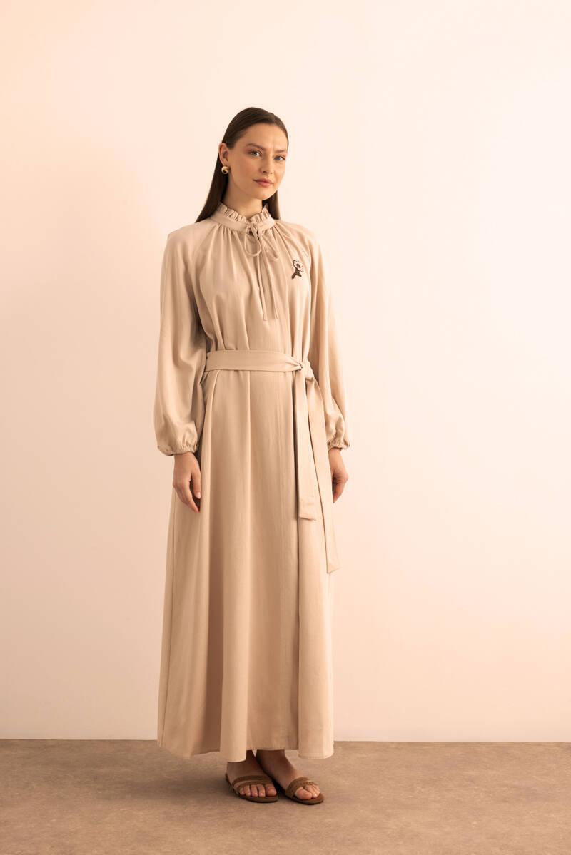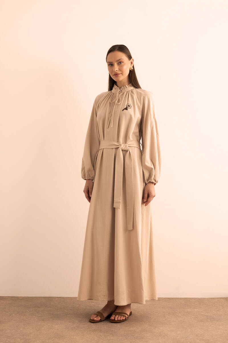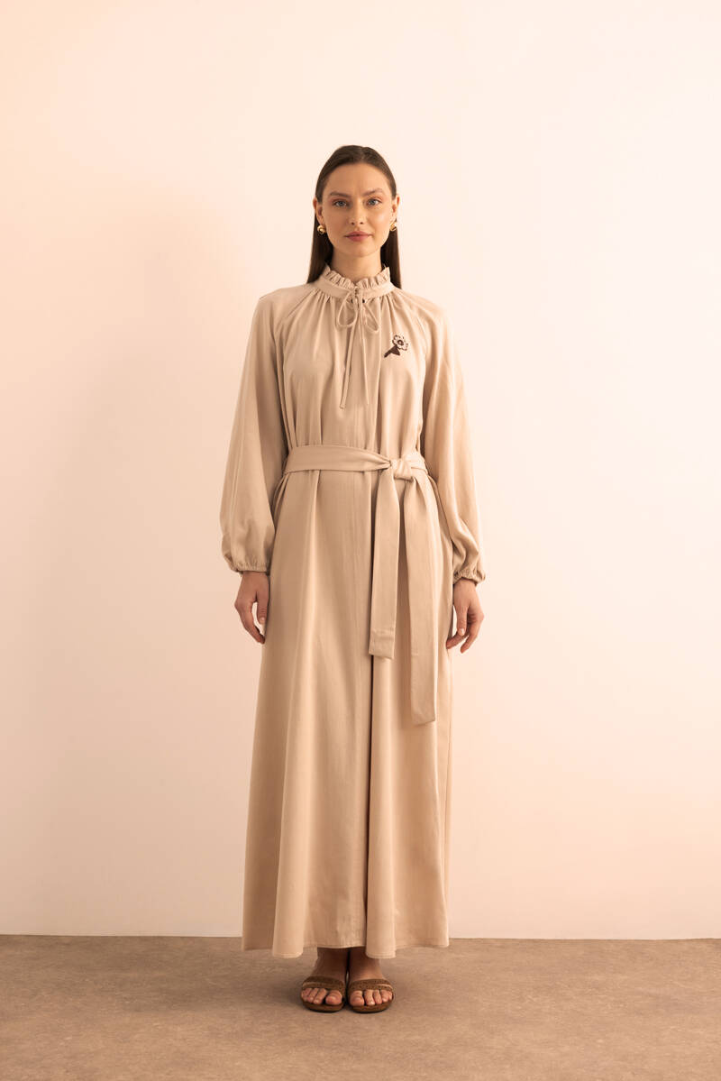 Bej Hacimli Cotton Brode Elbise