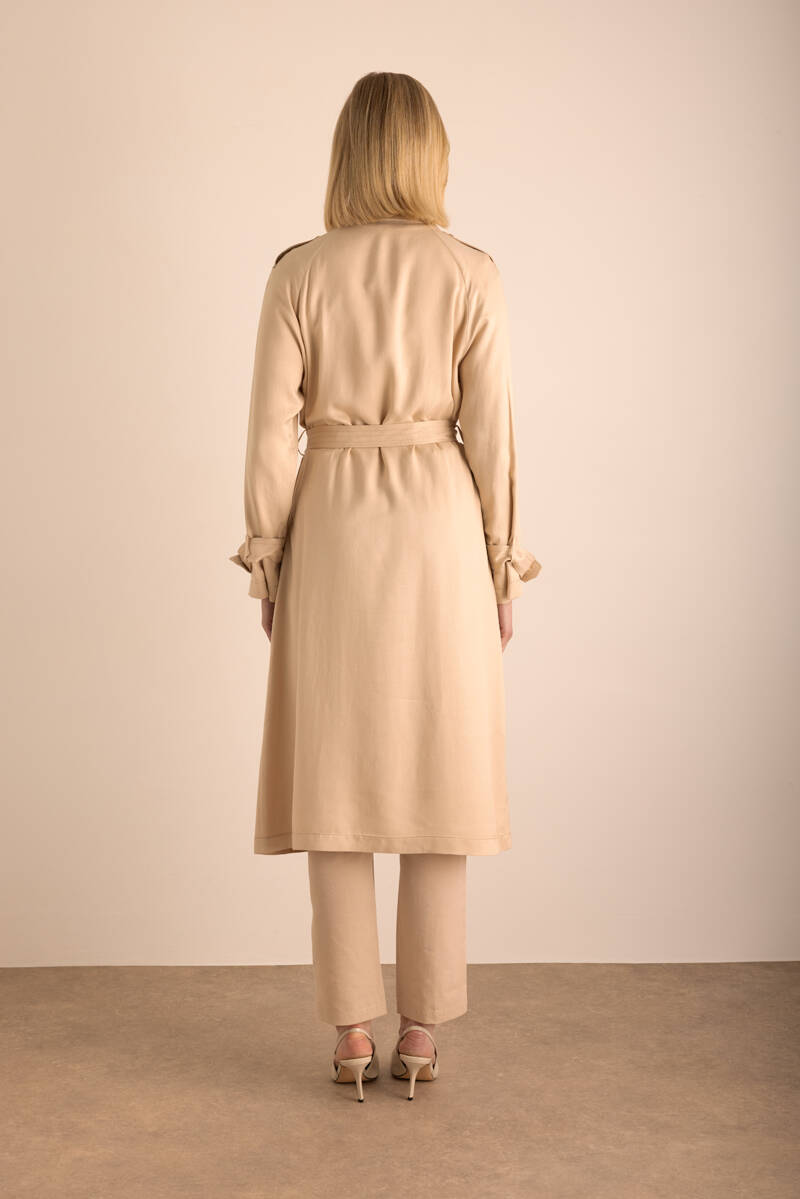 Bej Keten Karışımlı Dokuma Trençkot
