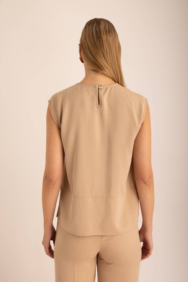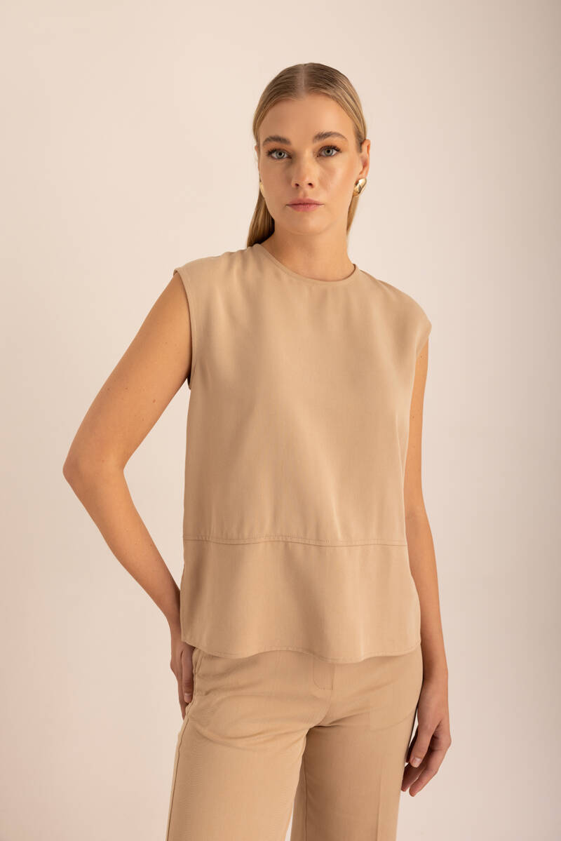 Ekru Omuzları Büzgü Detaylı Dokuma Kolsuz Bluz