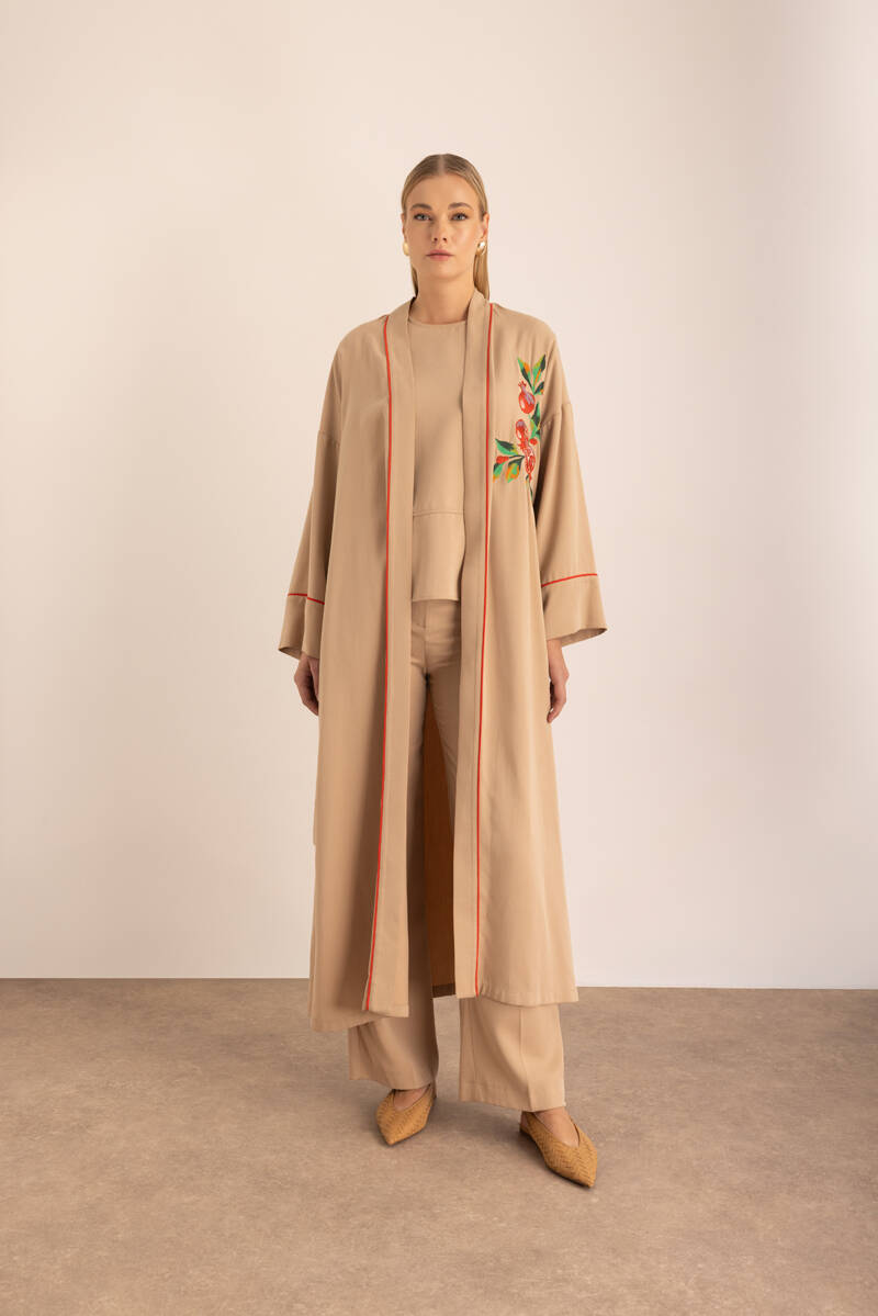 Ekru Yaprak Desenli Keten Yandan Bağlamalı Kimono