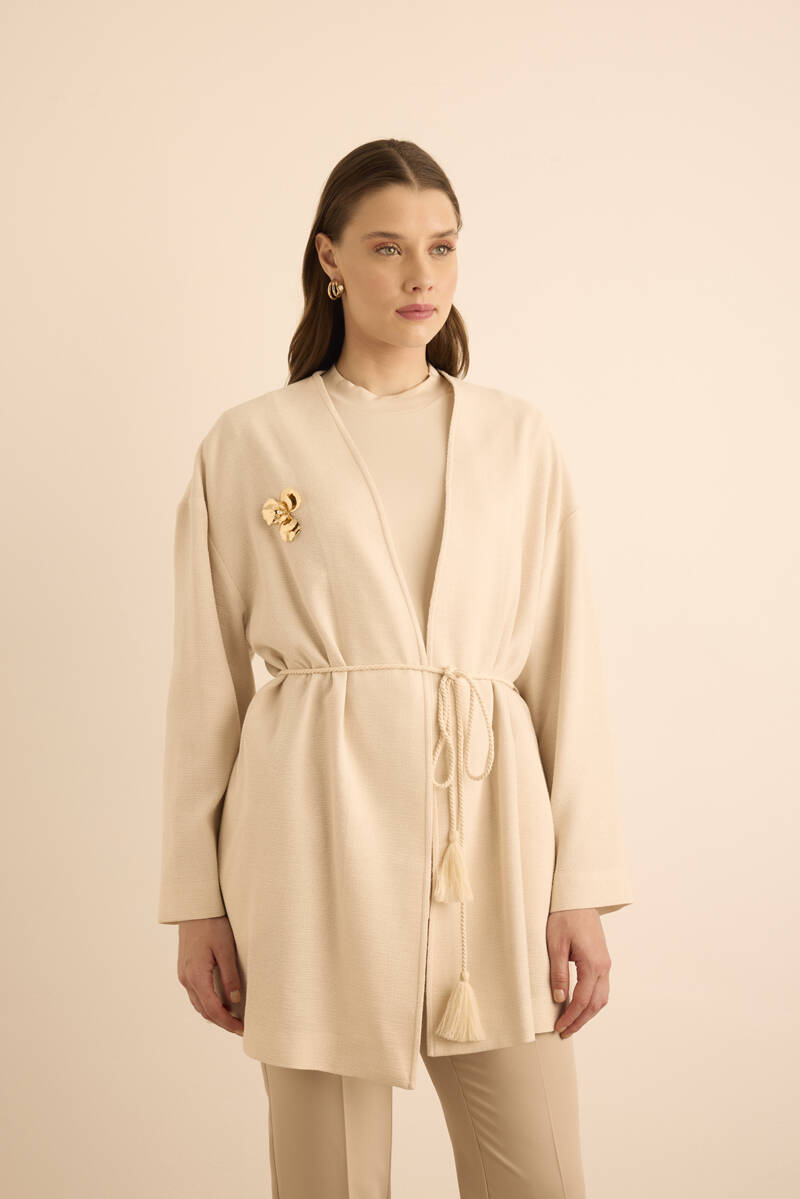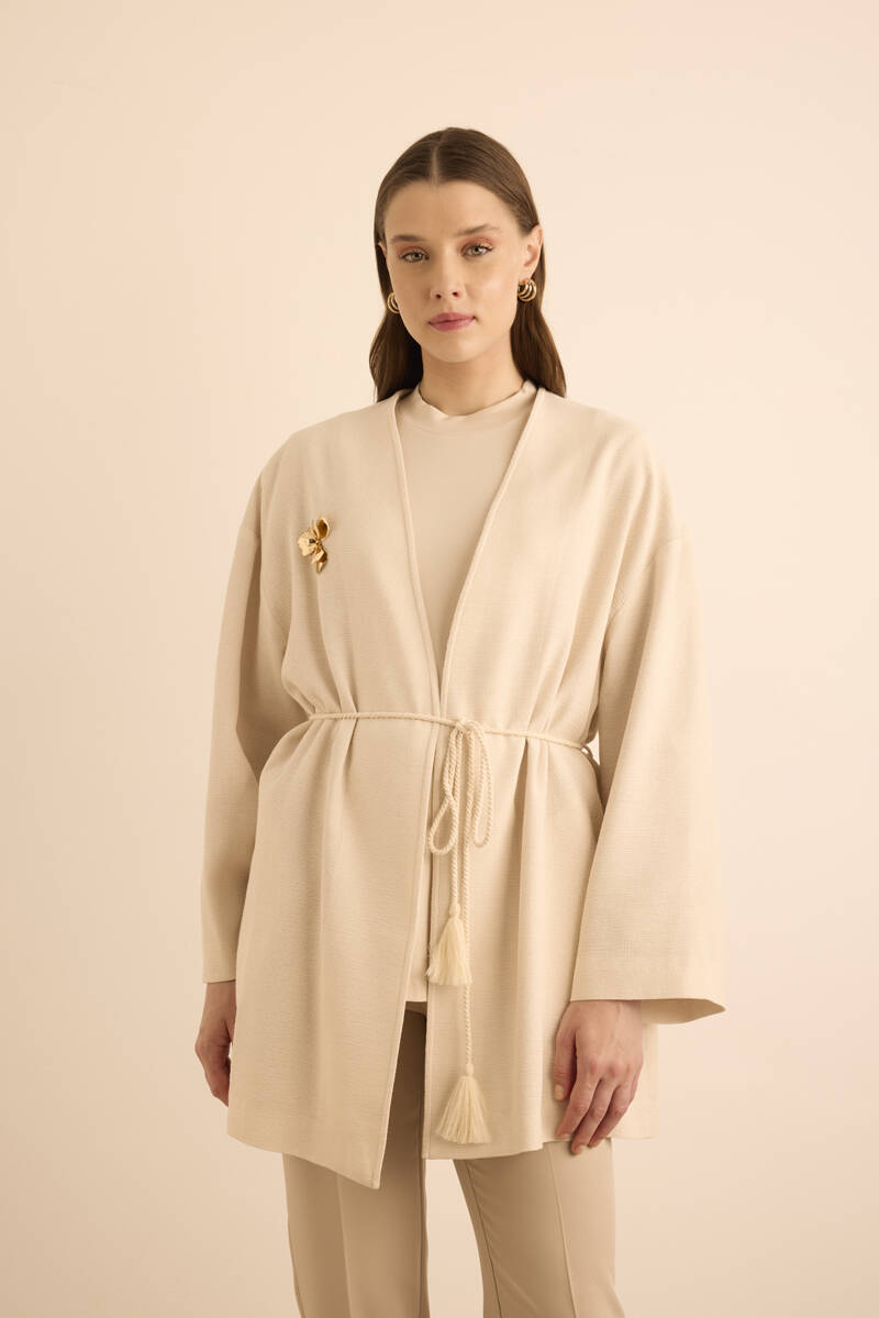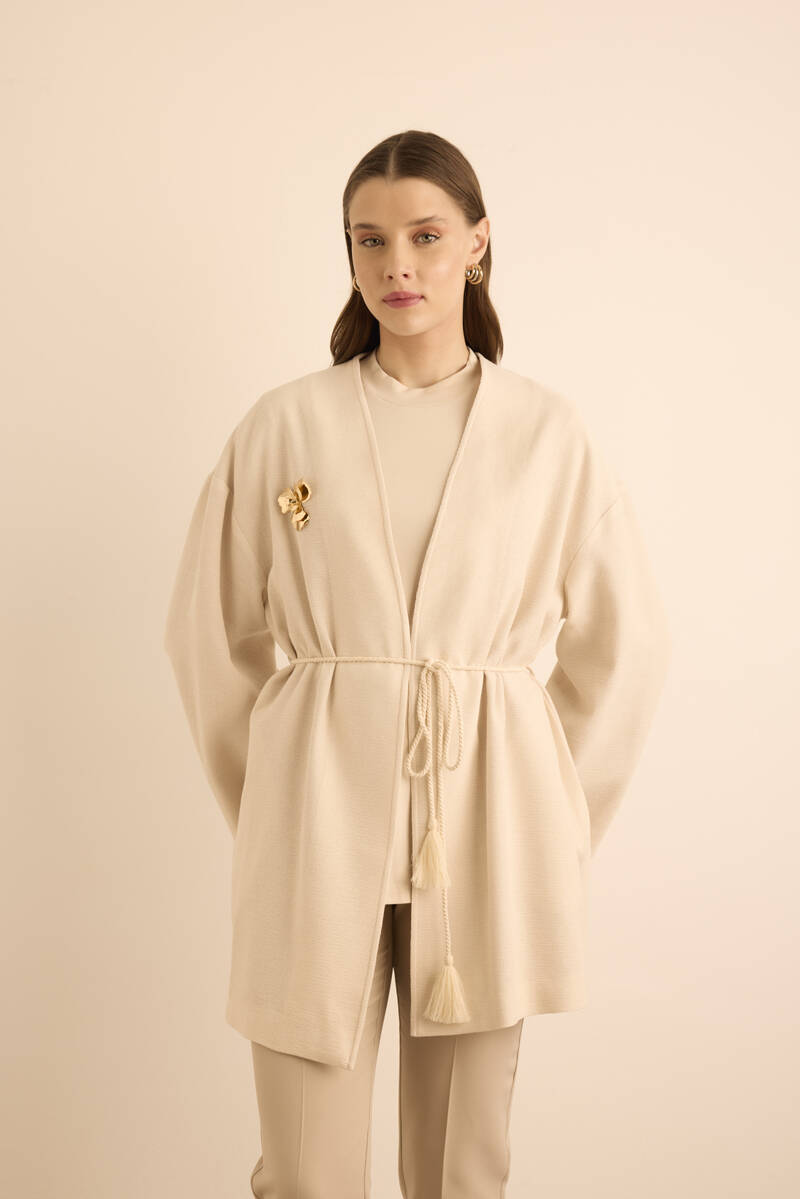 Bej Metal Broşlu Beli Kordon Bağcıklı Kap