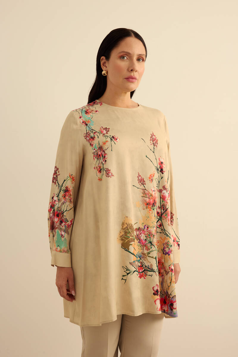 Ekru Belden Tek Tarafı Bağcık ve Büzgü Detaylı Tunik