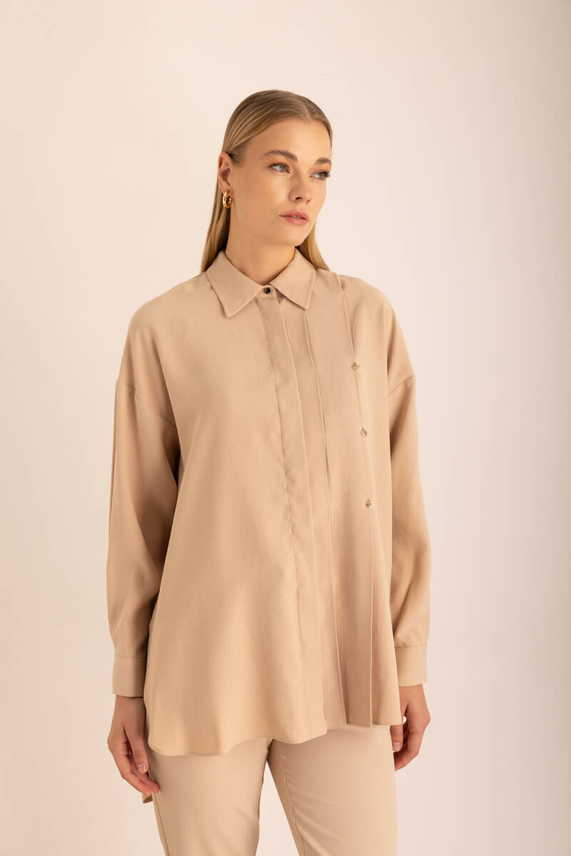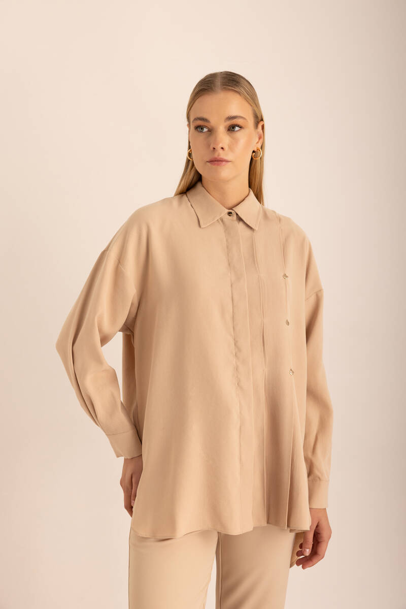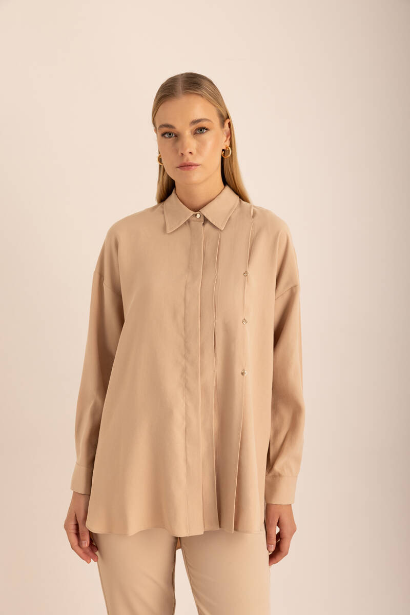 Bej Pileli Metal Logolu Bluz