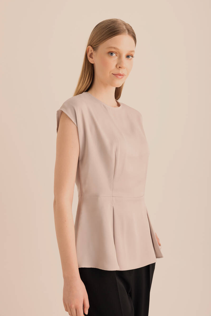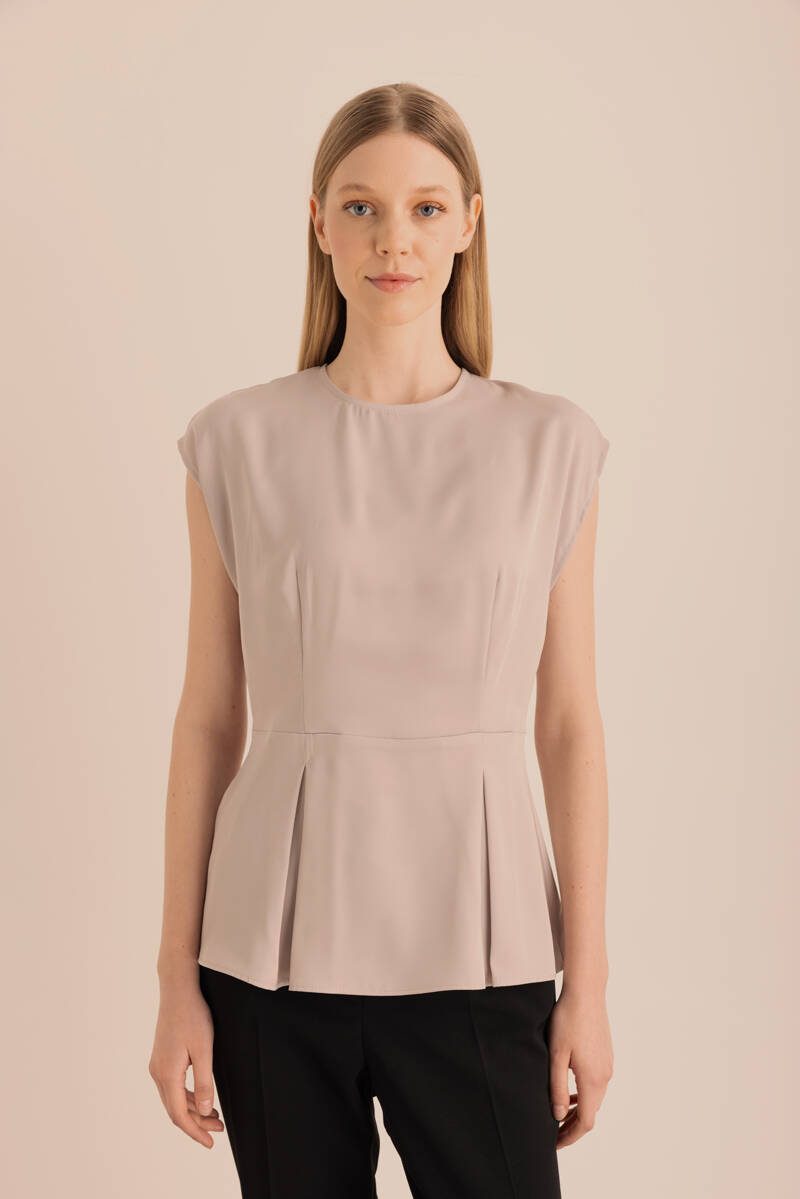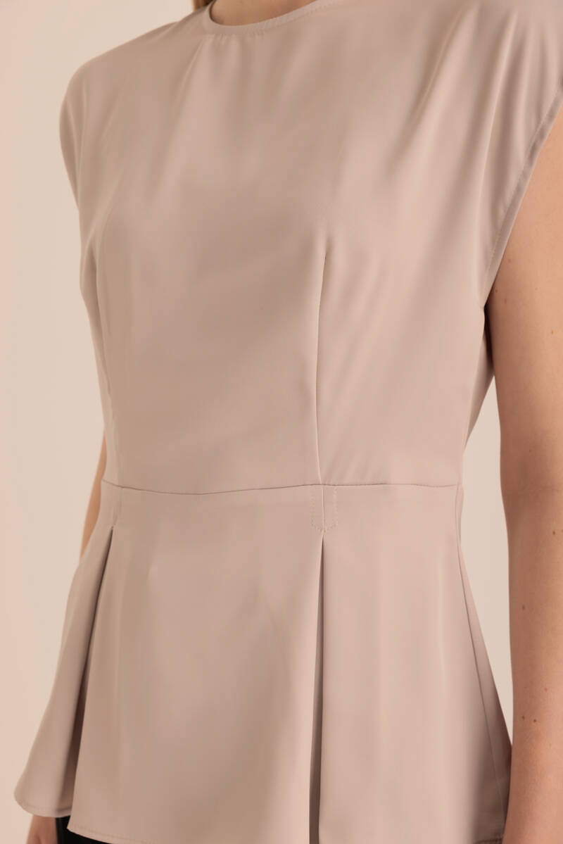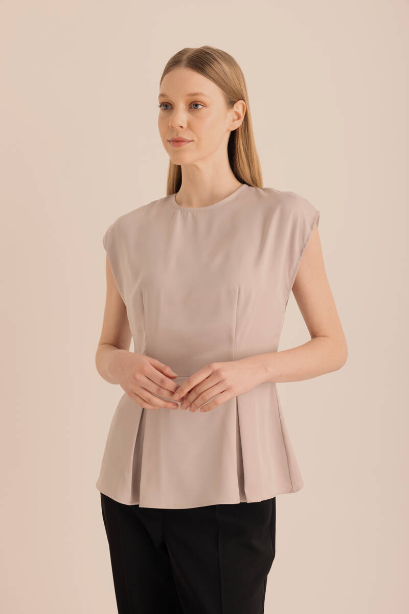 Ekru Omuzları Büzgü Detaylı Dokuma Kolsuz Bluz