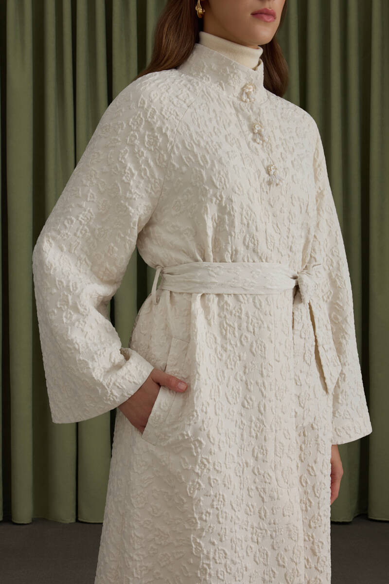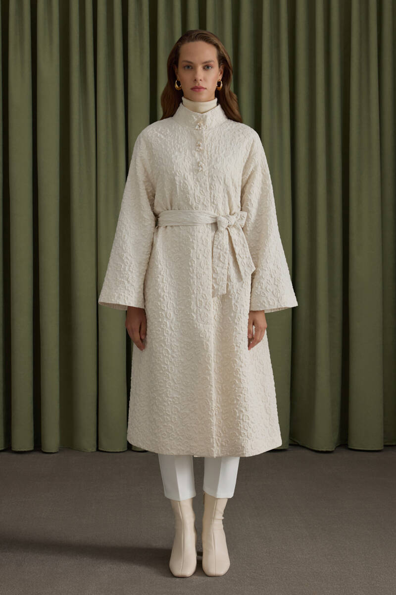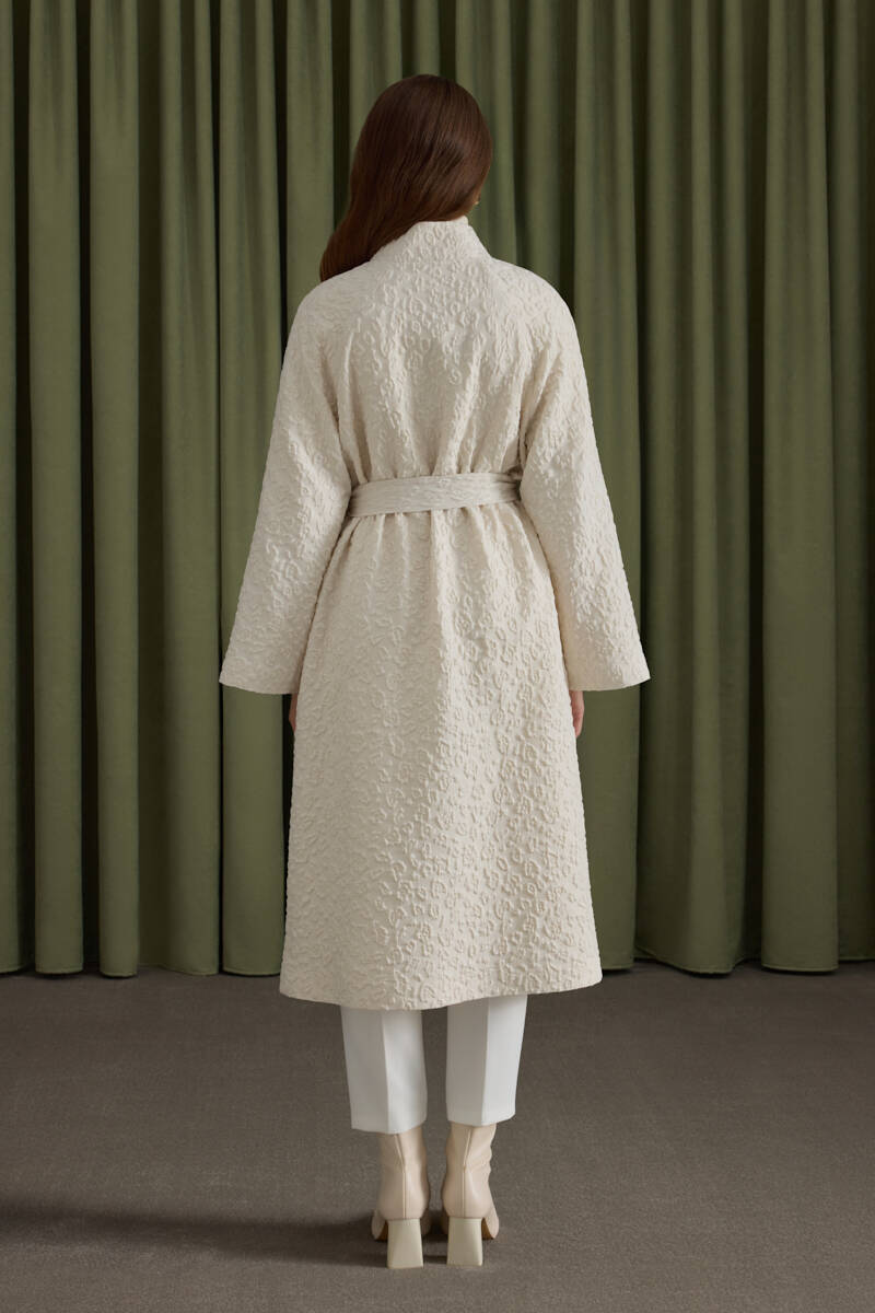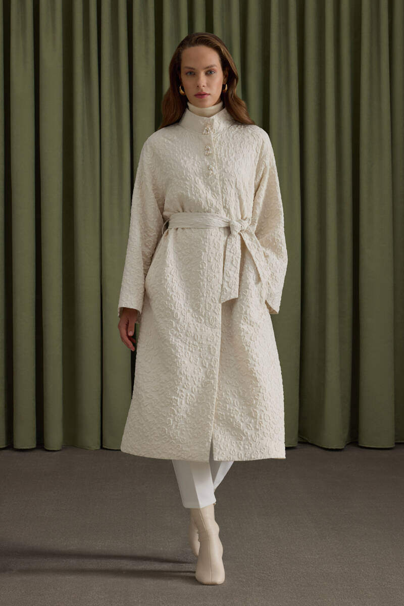 Ekru Belden Büzgülü Düğme Detaylı Mont