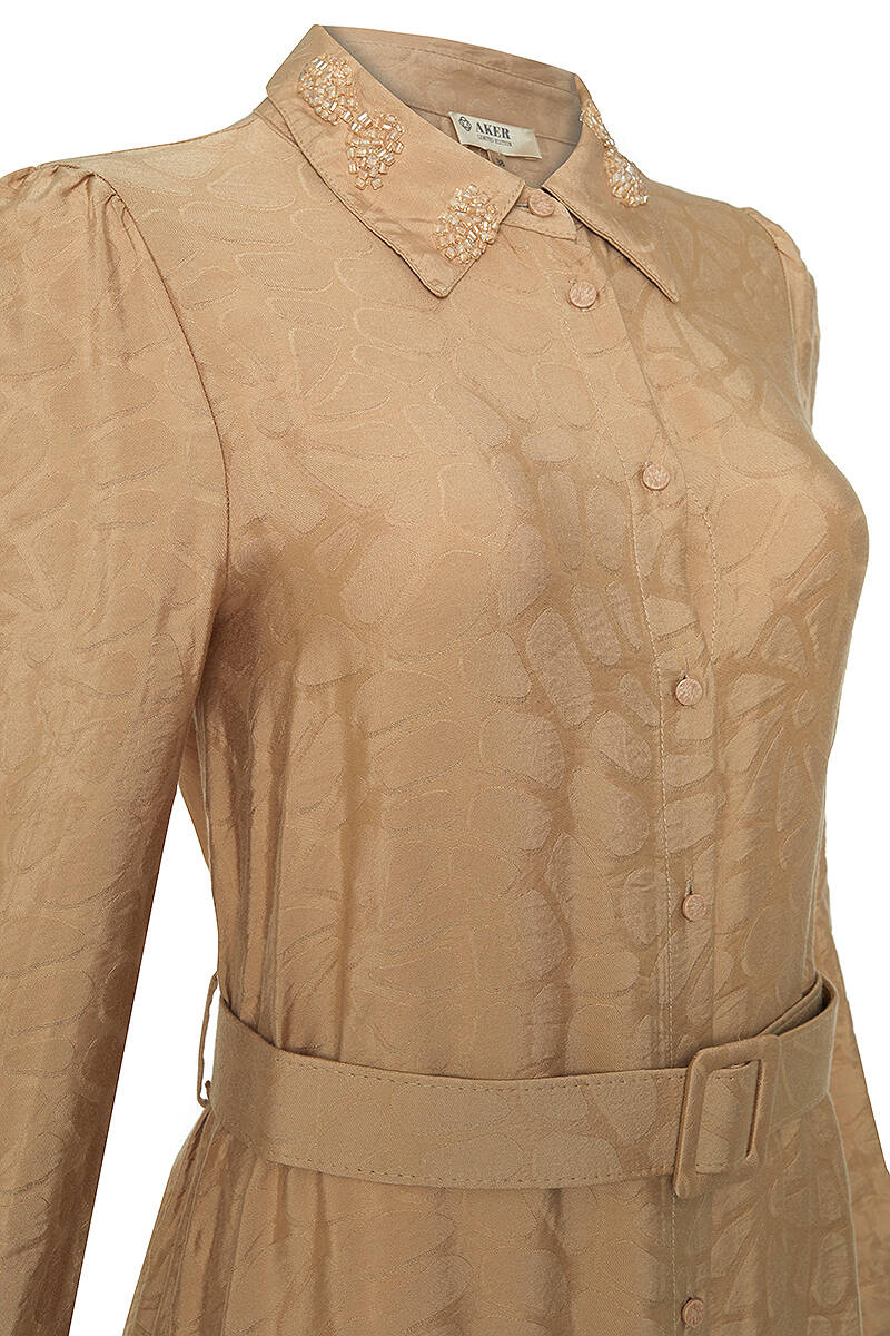 Bej Yakası İşlemeli Kemer Detaylı Elbise