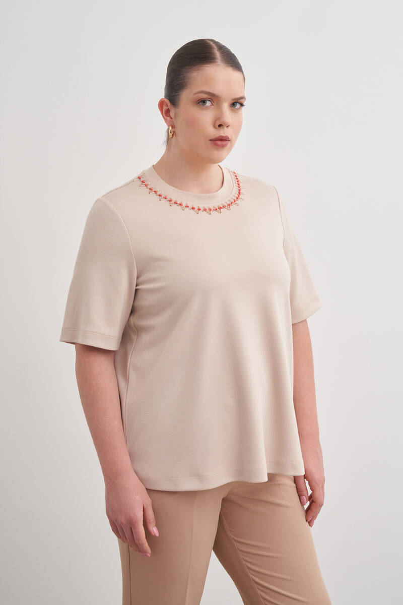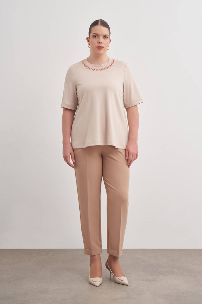 Bej Yakası İşlemeli Örme Kısa Kollu Bluz