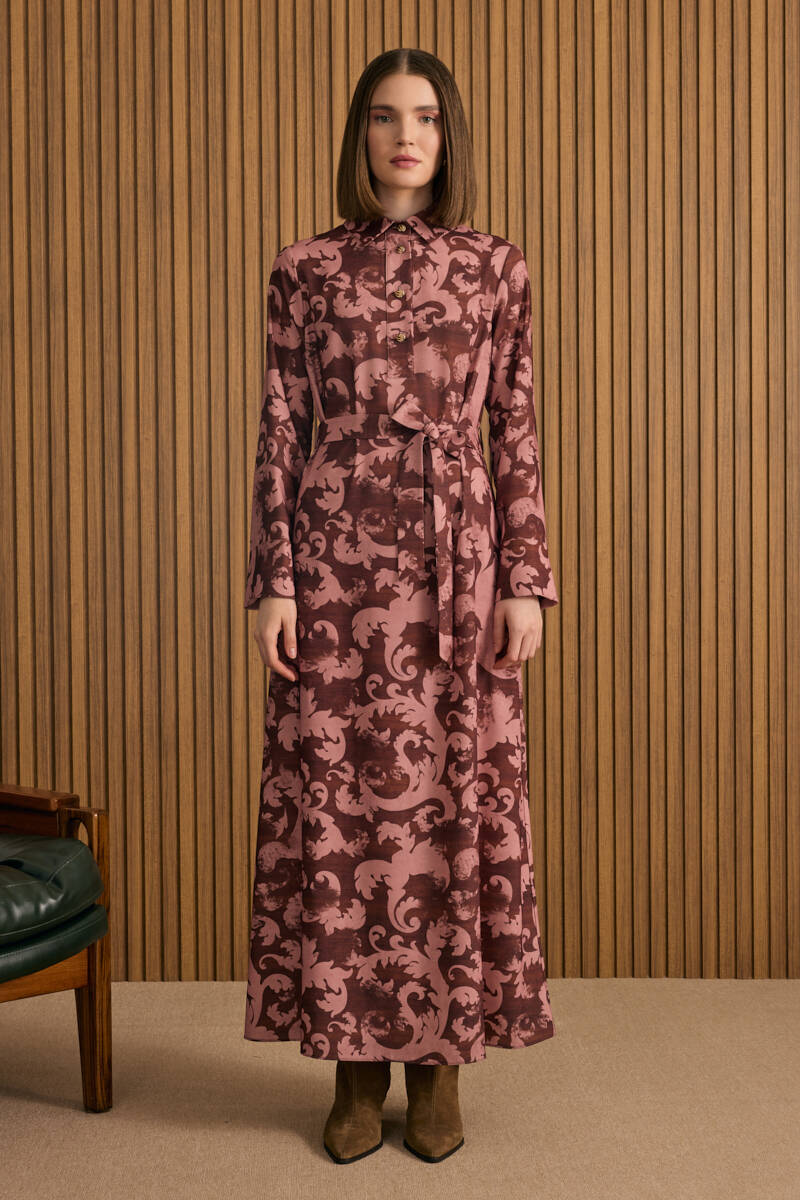 Somon Desenli Beli Bağlama Detaylı Elbise