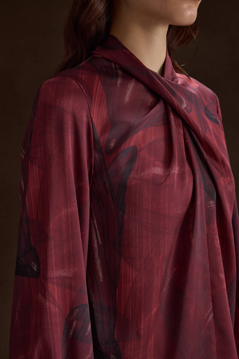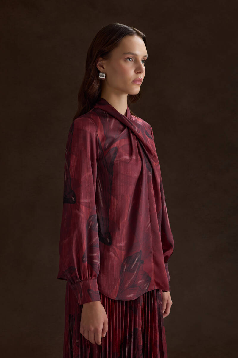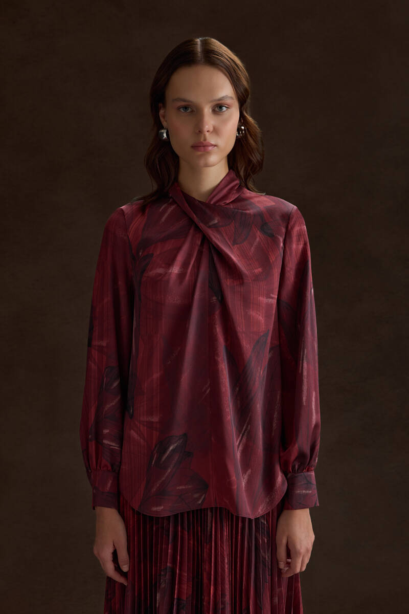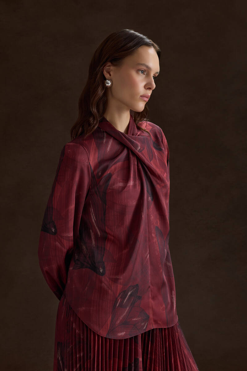 Kırmızı Çiçek Desenli İnce Dokuma Bluz