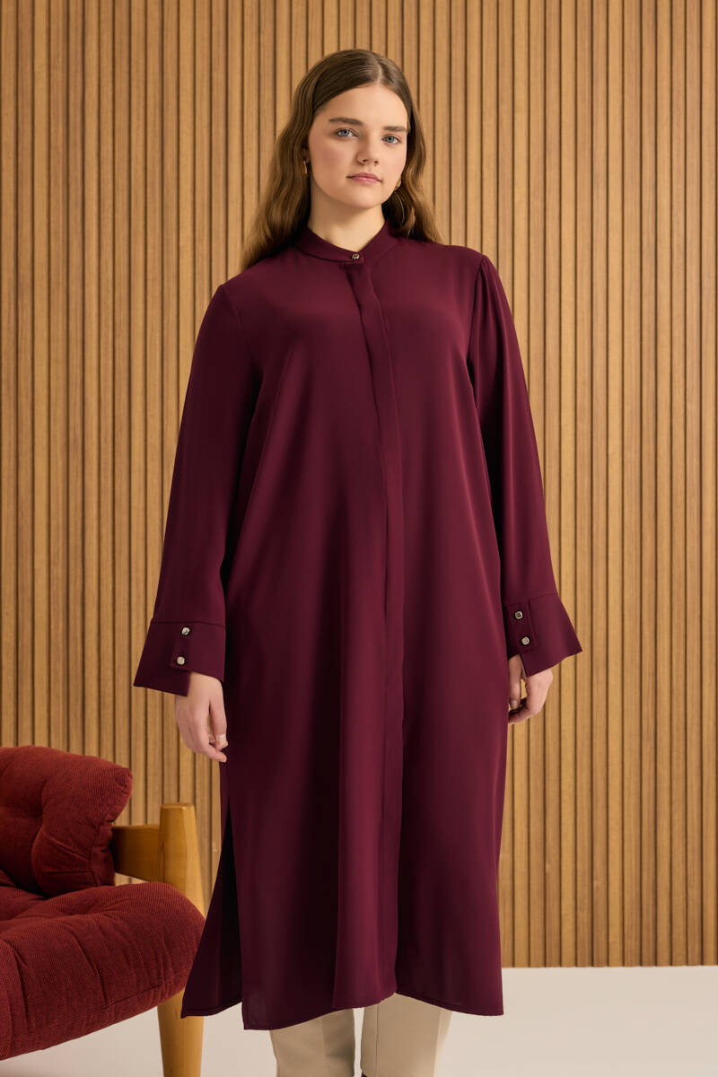 Kahverengi Yakası Fermuarlı Keten Tencel Tunik