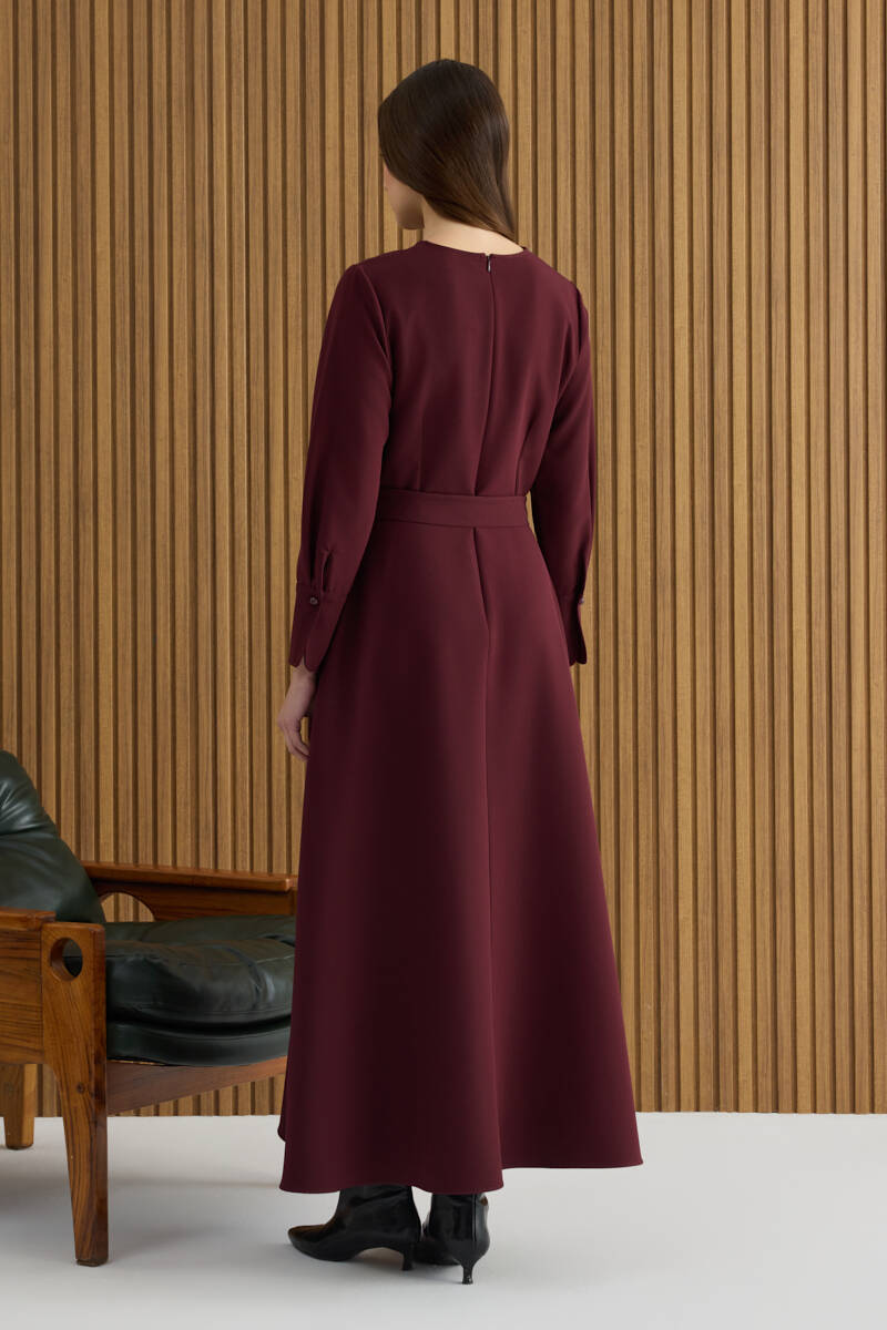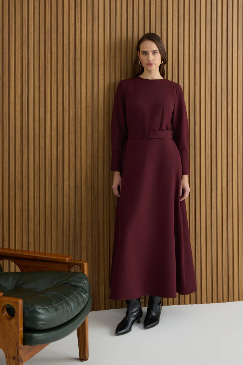 Bordo Kemerli Evaze Elbise