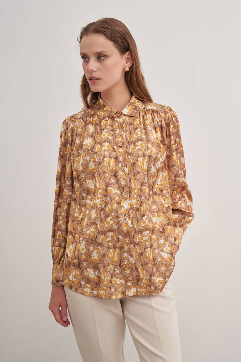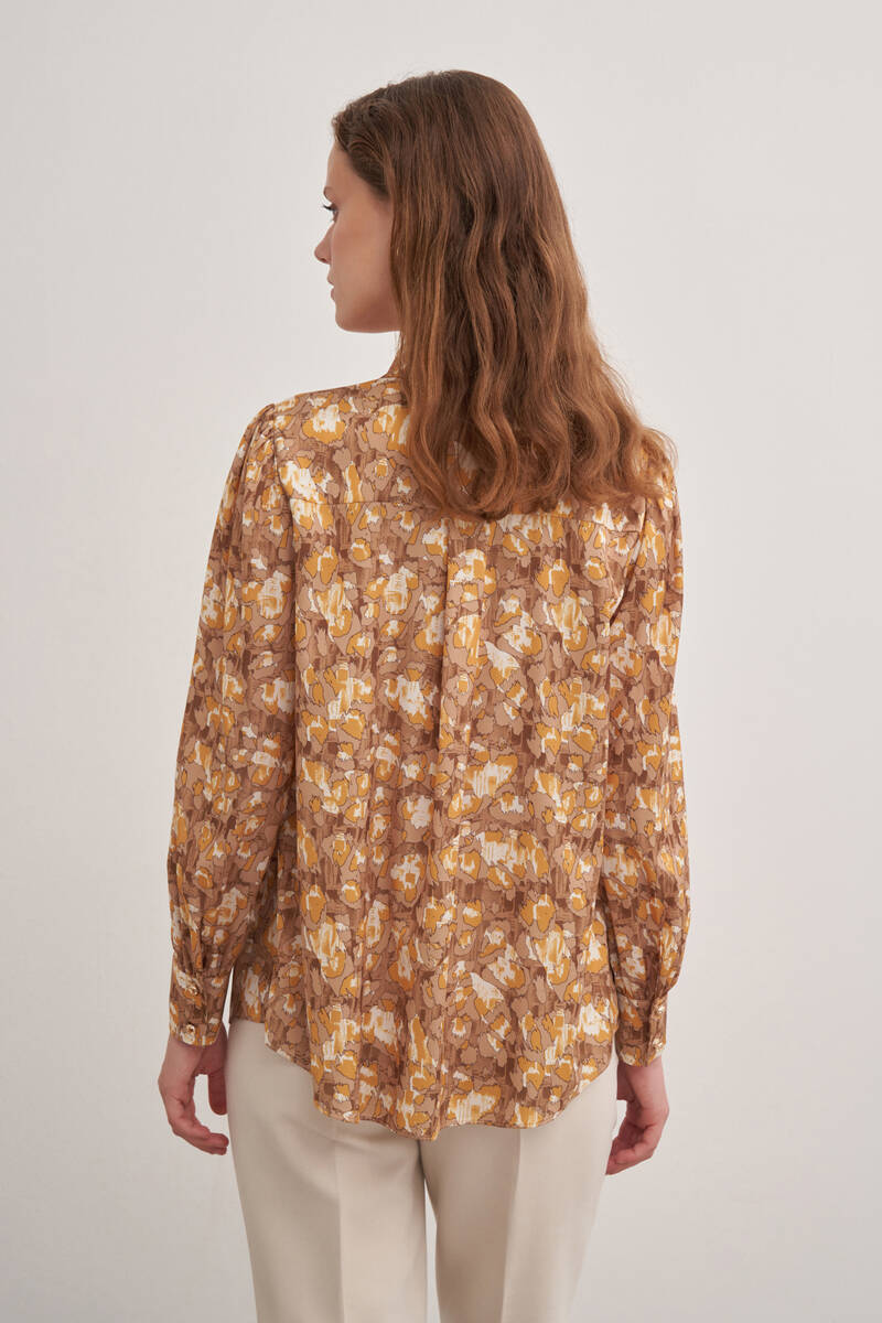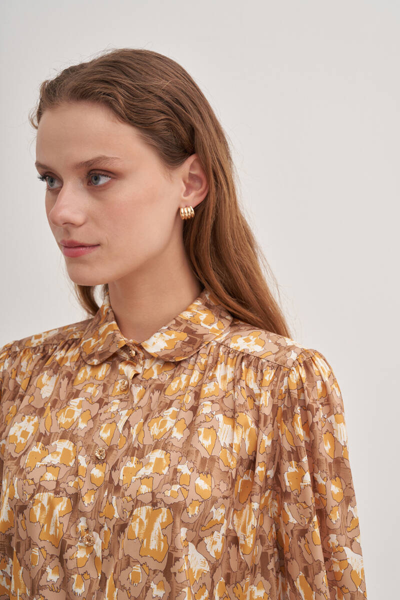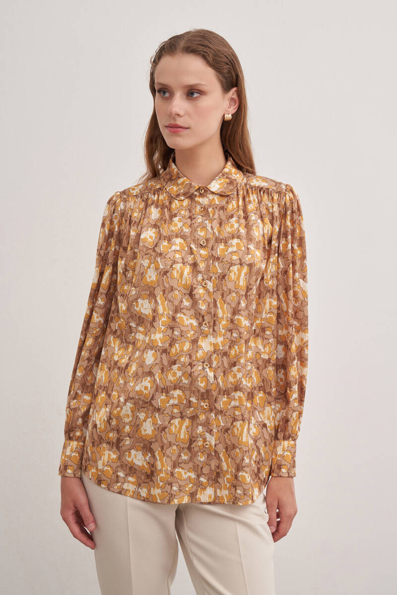 Pembe Batik Desenli Dik Yakalı Bluz