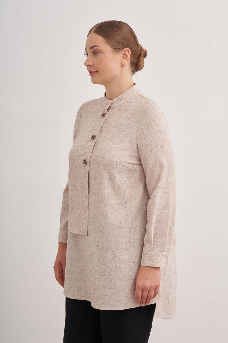 Kahverengi Yakası Fermuarlı Keten Tencel Tunik