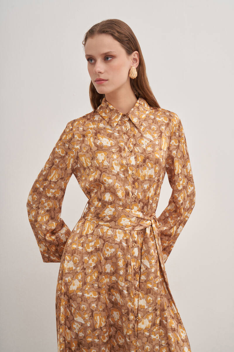 Somon Desenli Beli Bağlama Detaylı Elbise