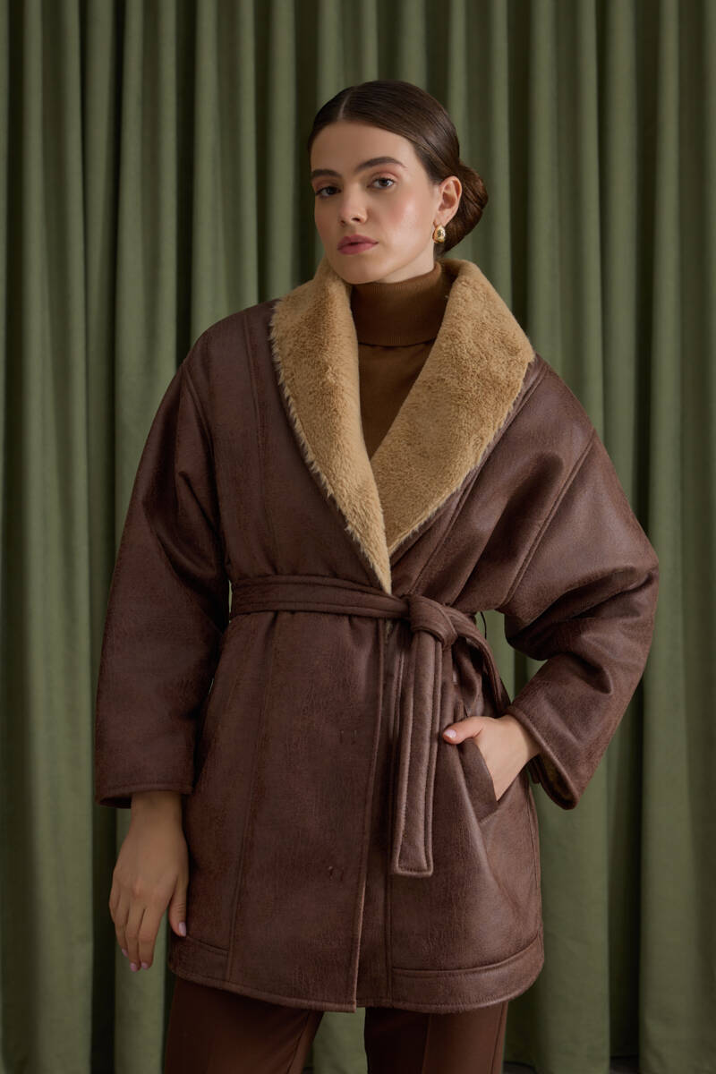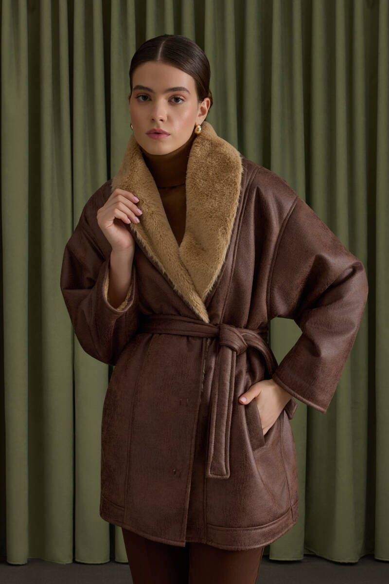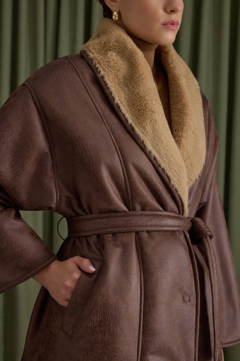 Siyah İçi Kürk, Suni Deri Şal Yaka Kaban