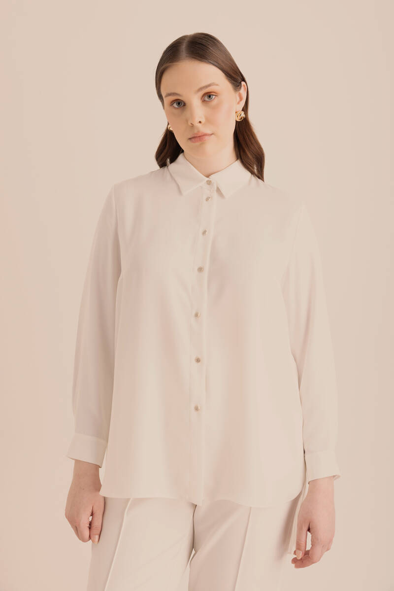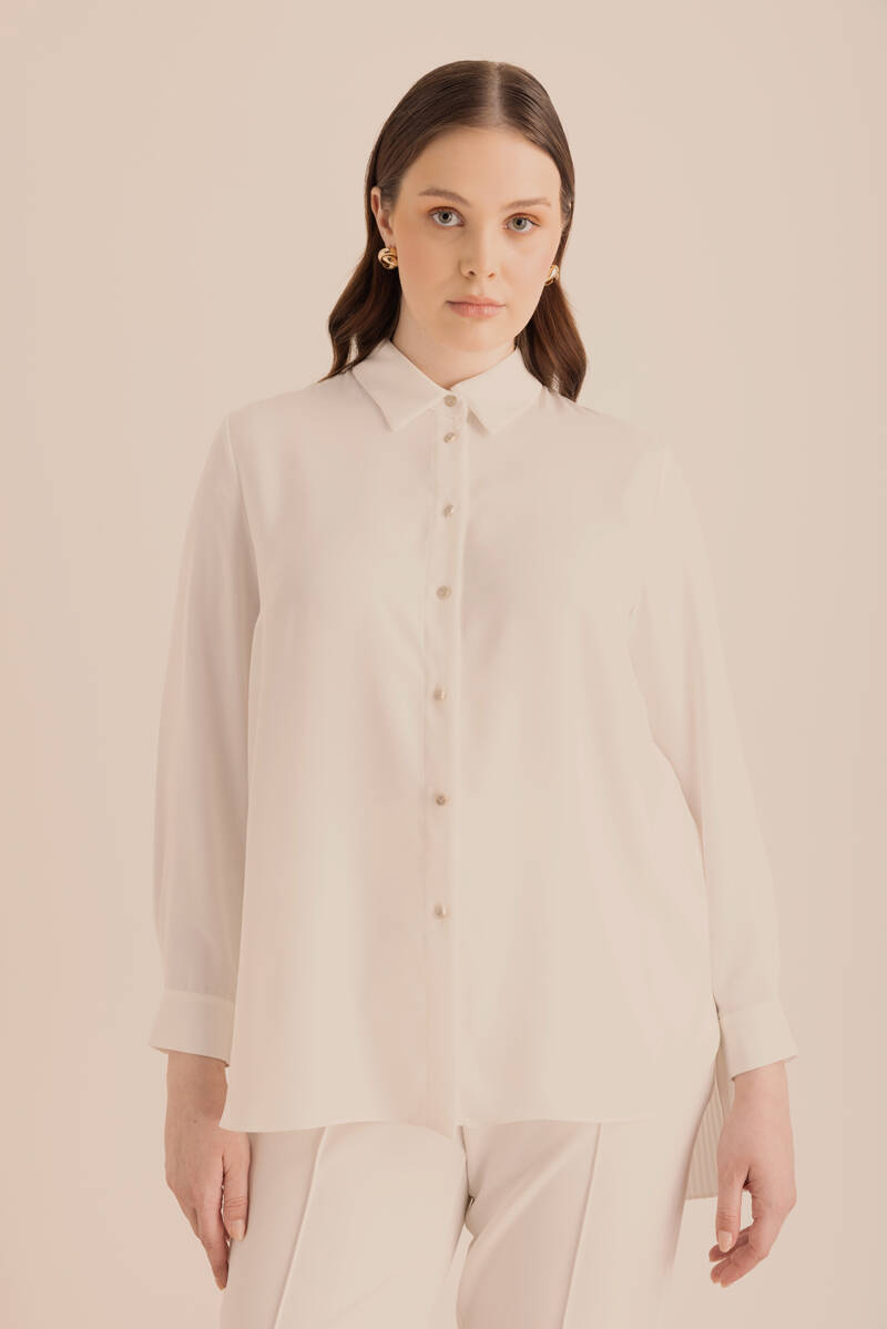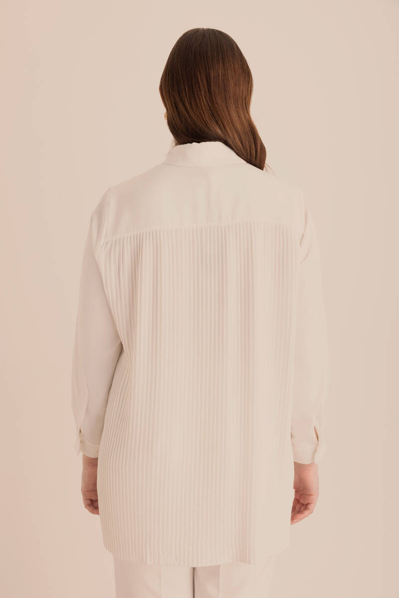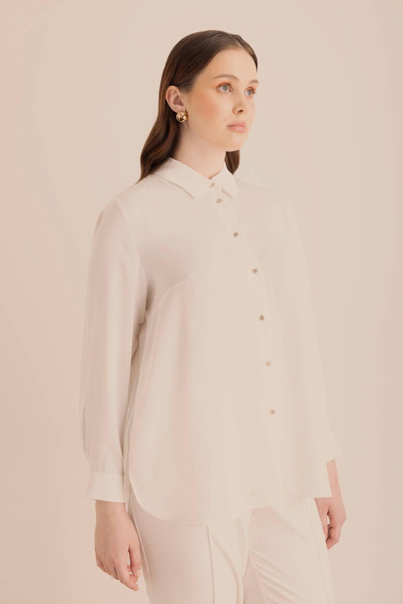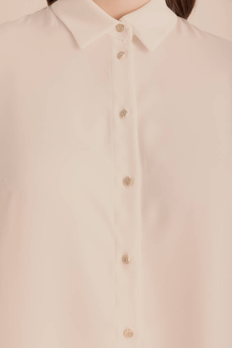 Ekru Belden Tek Tarafı Bağcık ve Büzgü Detaylı Tunik
