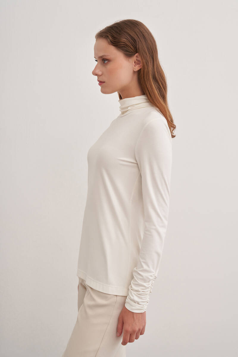 Ekru Omuzları Büzgü Detaylı Dokuma Kolsuz Bluz