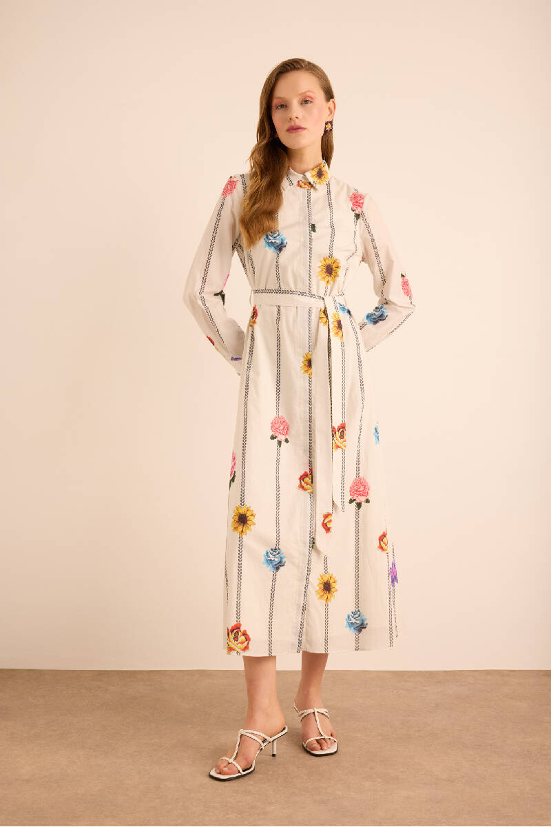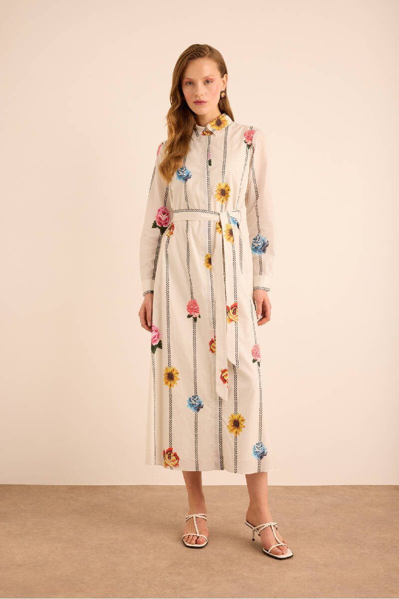 Ekru Kumaşı Püskül Yüzeyli Cotton Gömlek Elbise