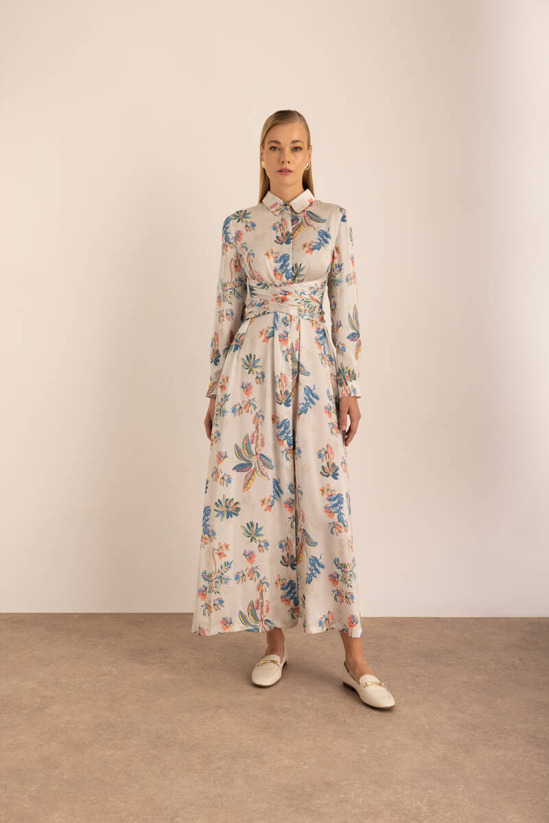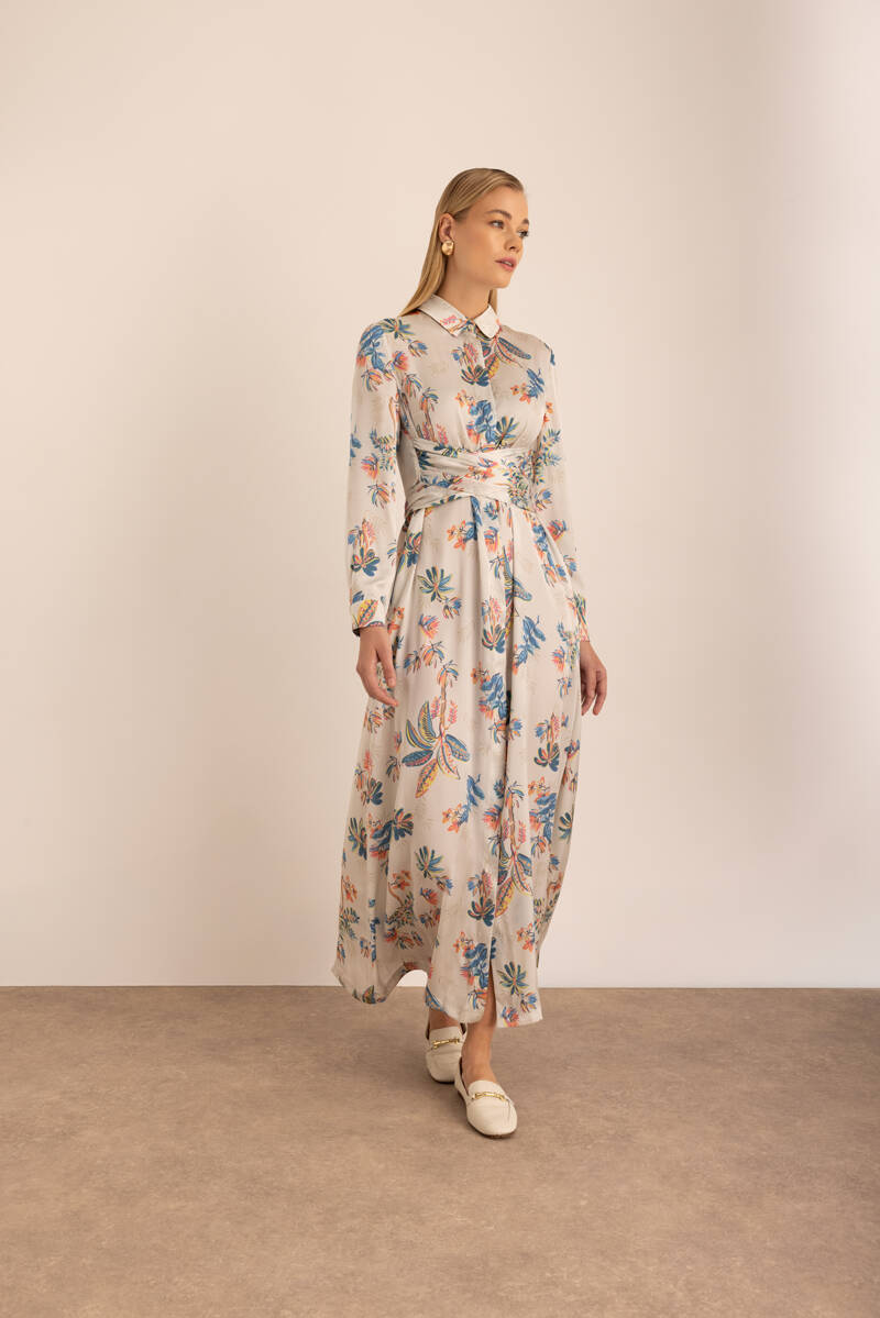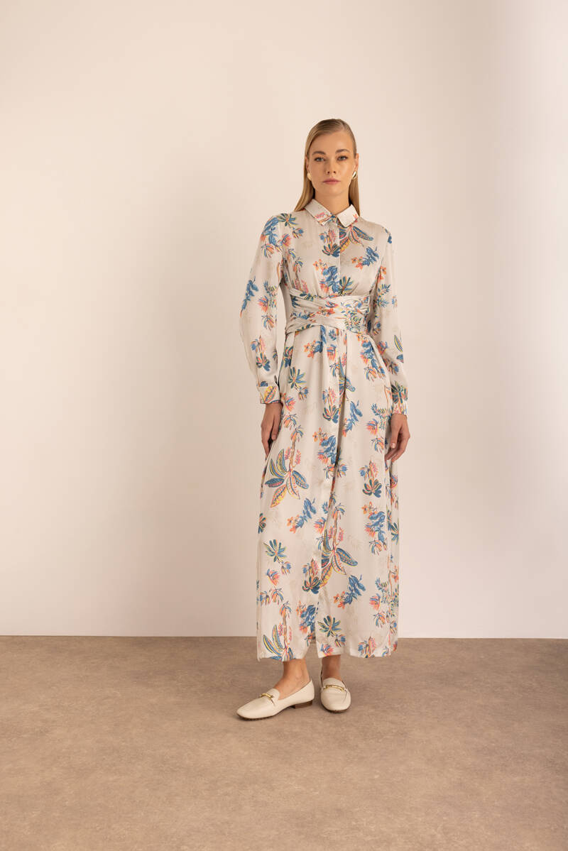Turkuaz Çiçek Desenli Beli Bağlama Detaylı Elbise