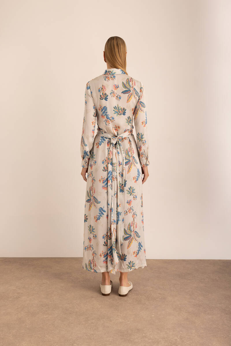 Somon Desenli Beli Bağlama Detaylı Elbise