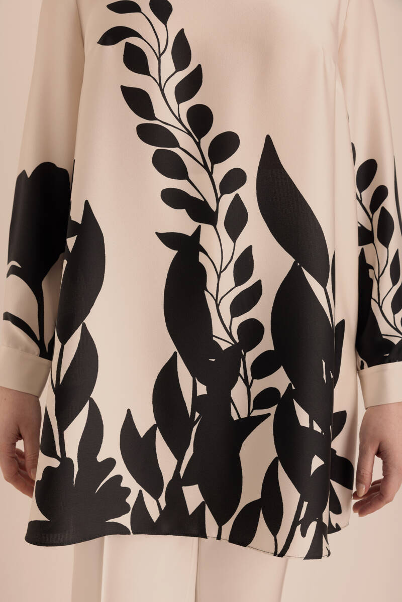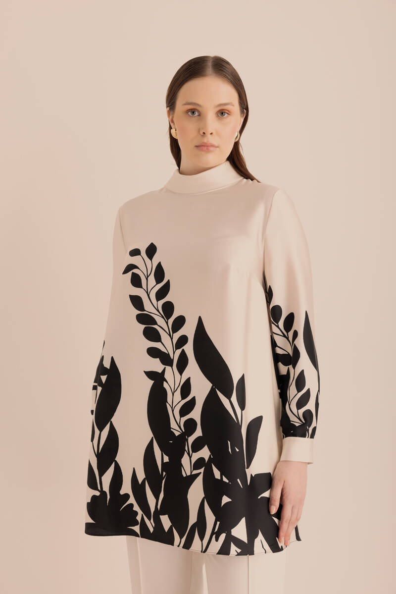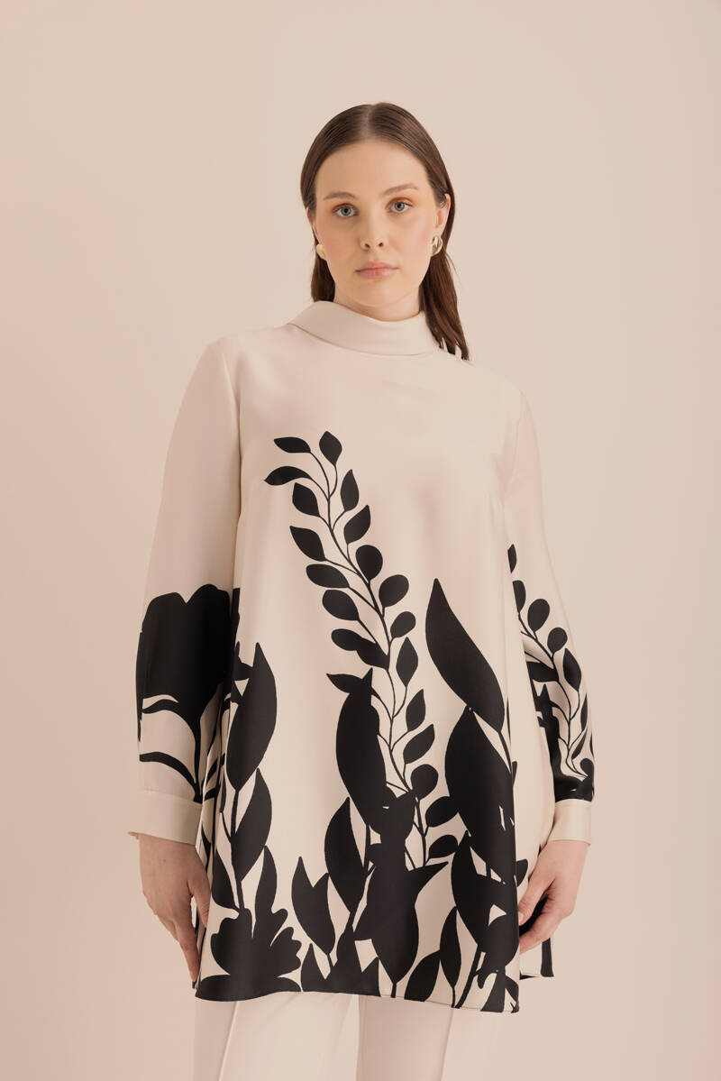 Siyah Yakası Fermuarlı Keten Tencel Tunik