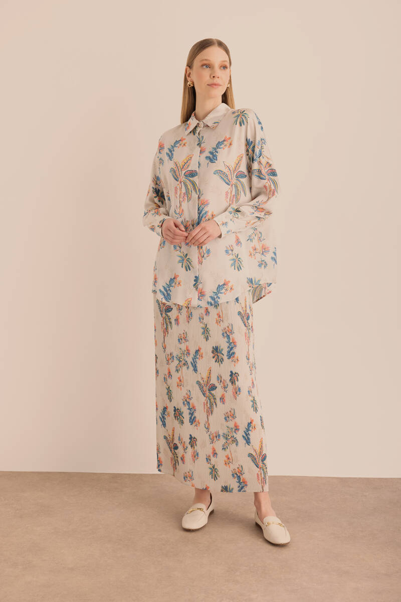 Ekru Desenli Bağlama Detaylı Gömlek Elbise