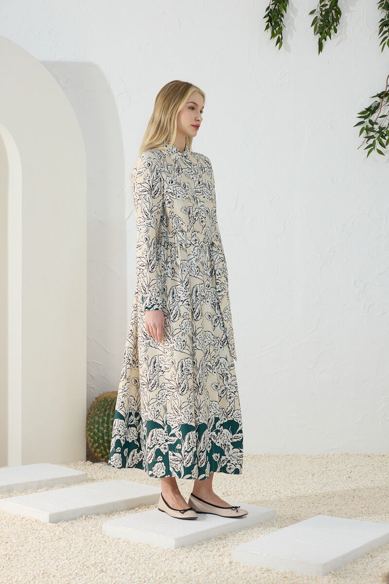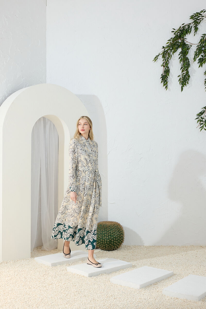 Bej Hacimli Cotton Brode Elbise
