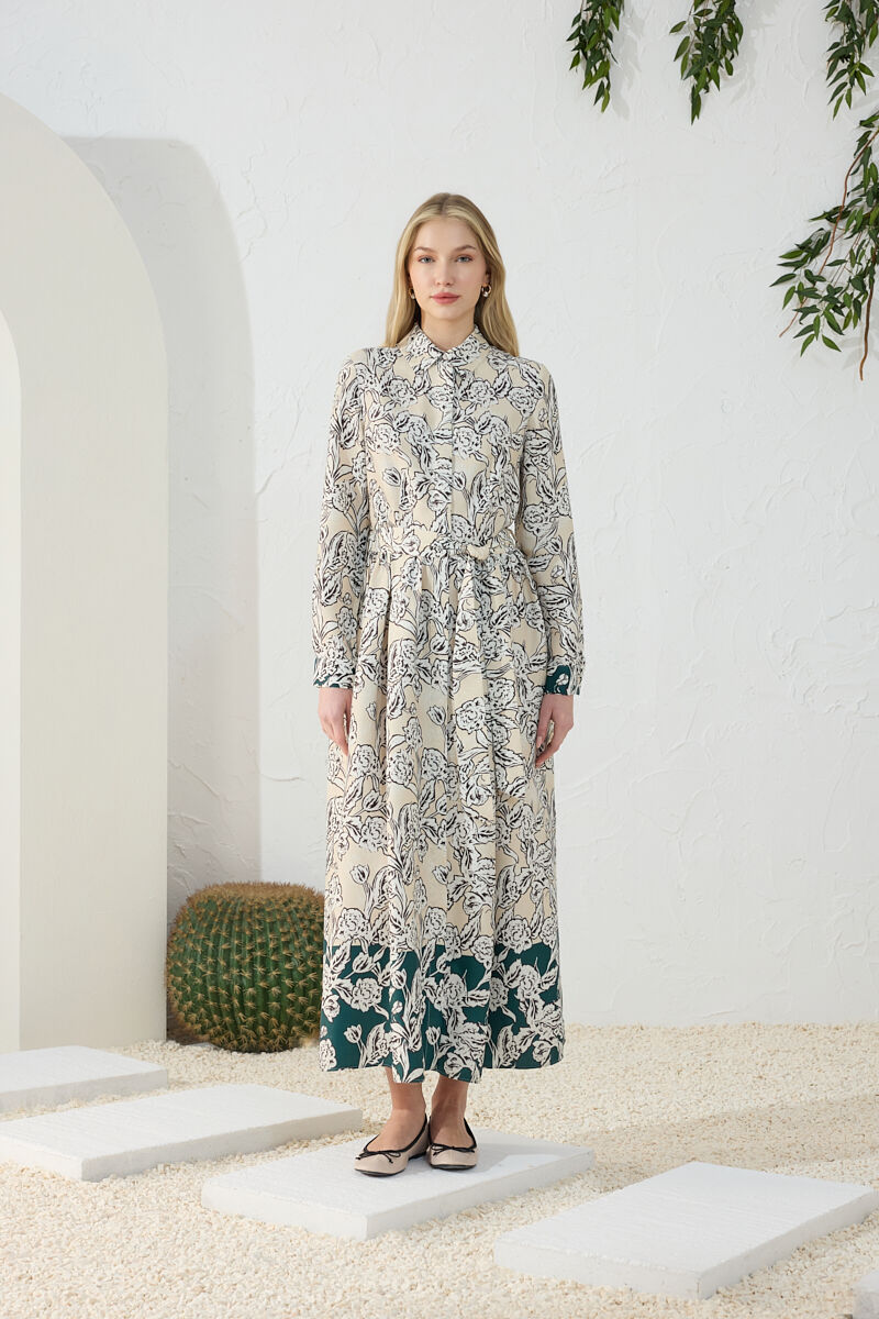 Turkuaz Çiçek Desenli Beli Bağlama Detaylı Elbise