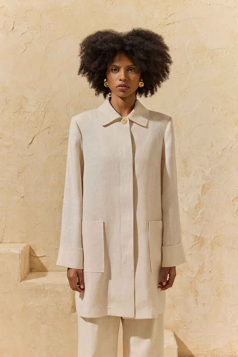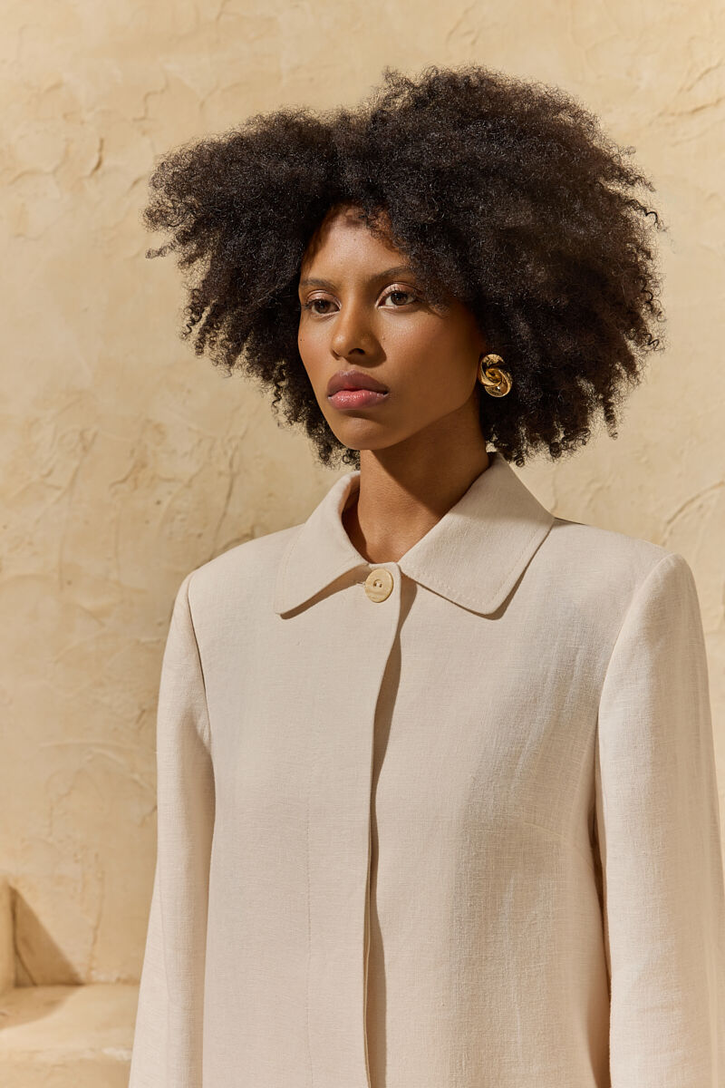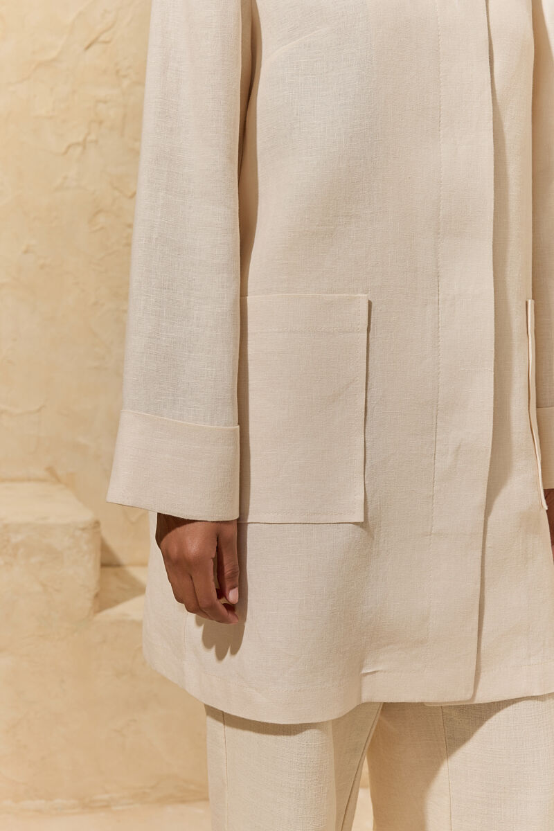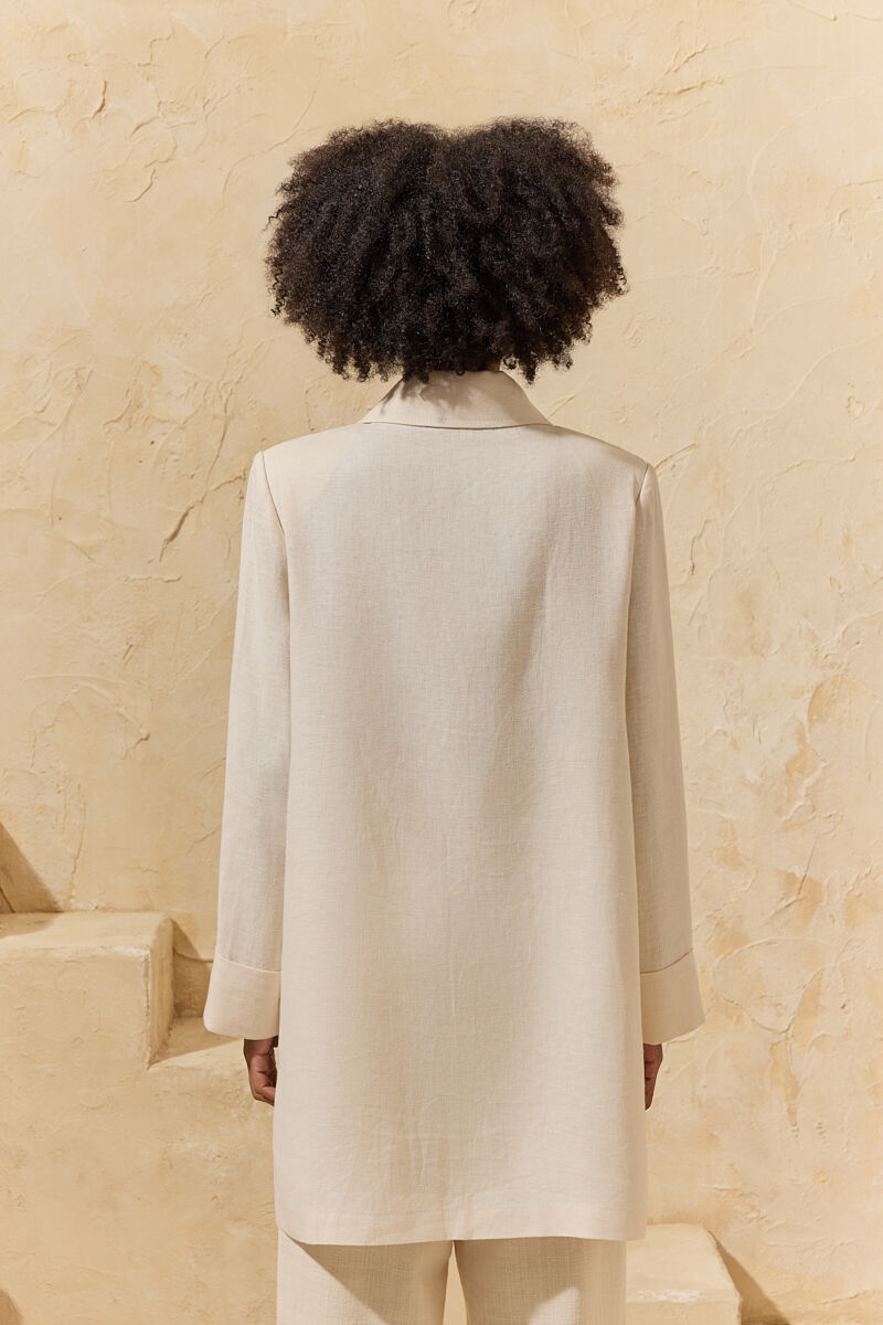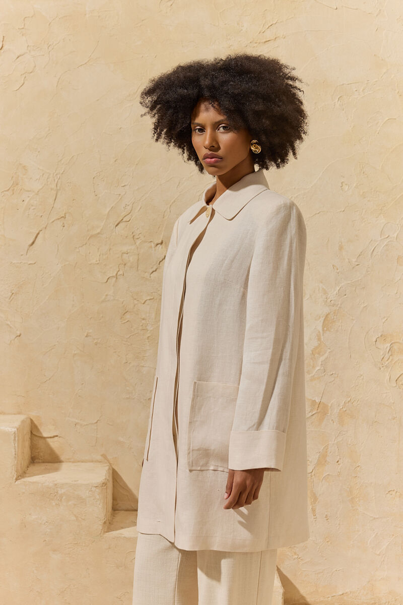 Ekru Yaprak Desenli Keten Yandan Bağlamalı Kimono