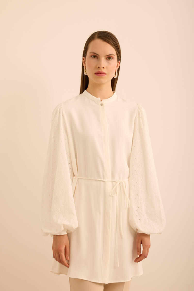 Ekru Fırfır ve Volan Detaylı Cotton Brode Tunik