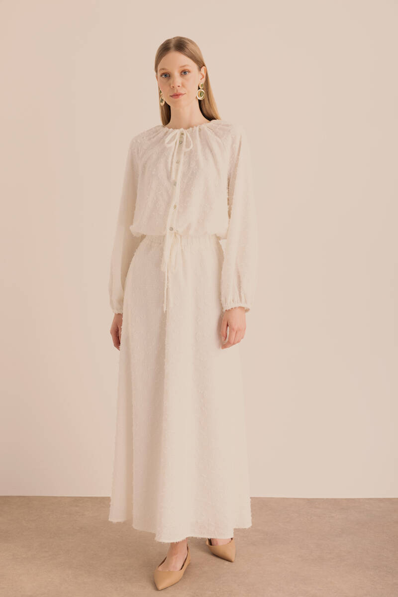 Ekru Kumaşı Püskül Detaylı Büzgülü Bluz