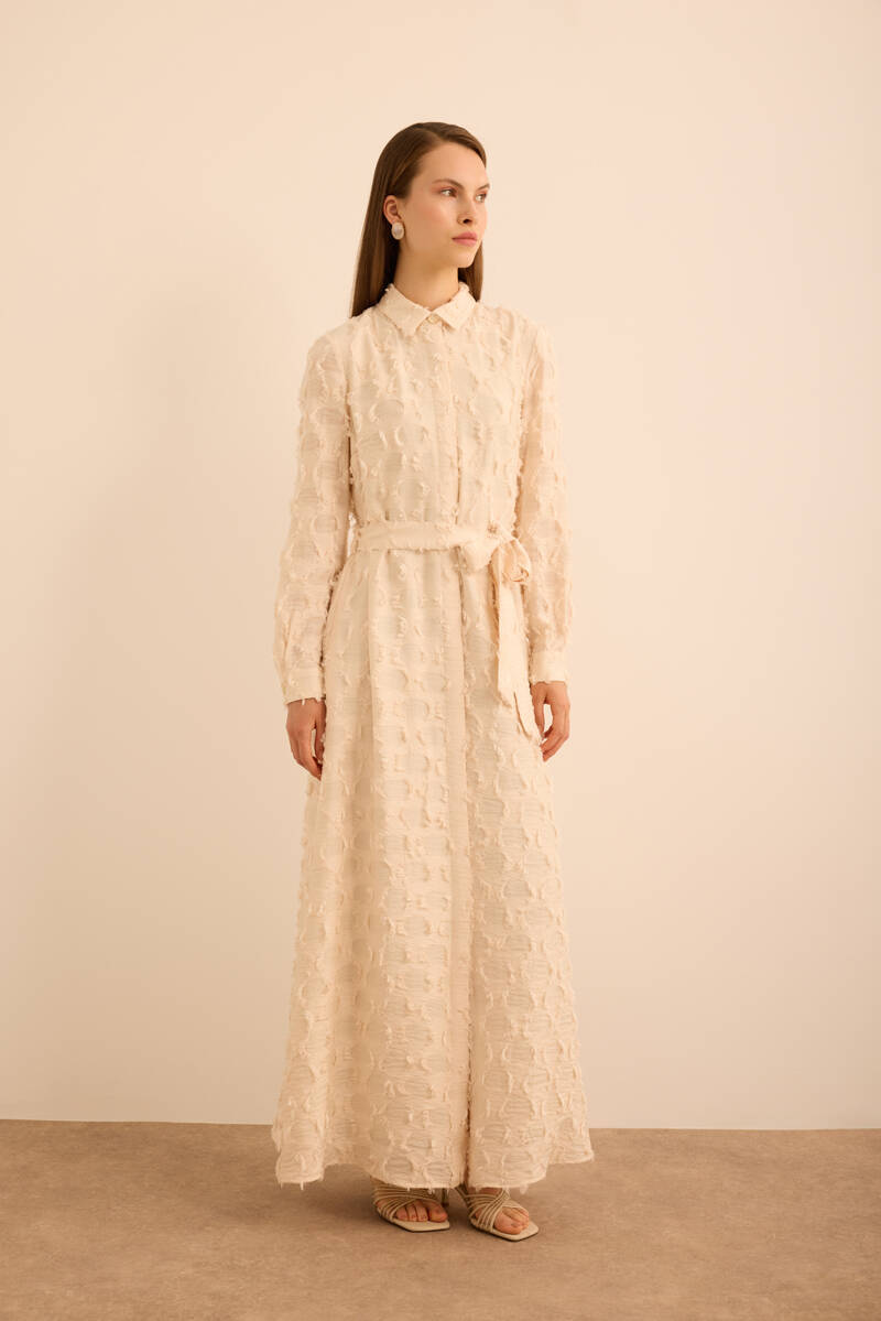 Ekru Kumaşı Püskül Yüzeyli Cotton Gömlek Elbise